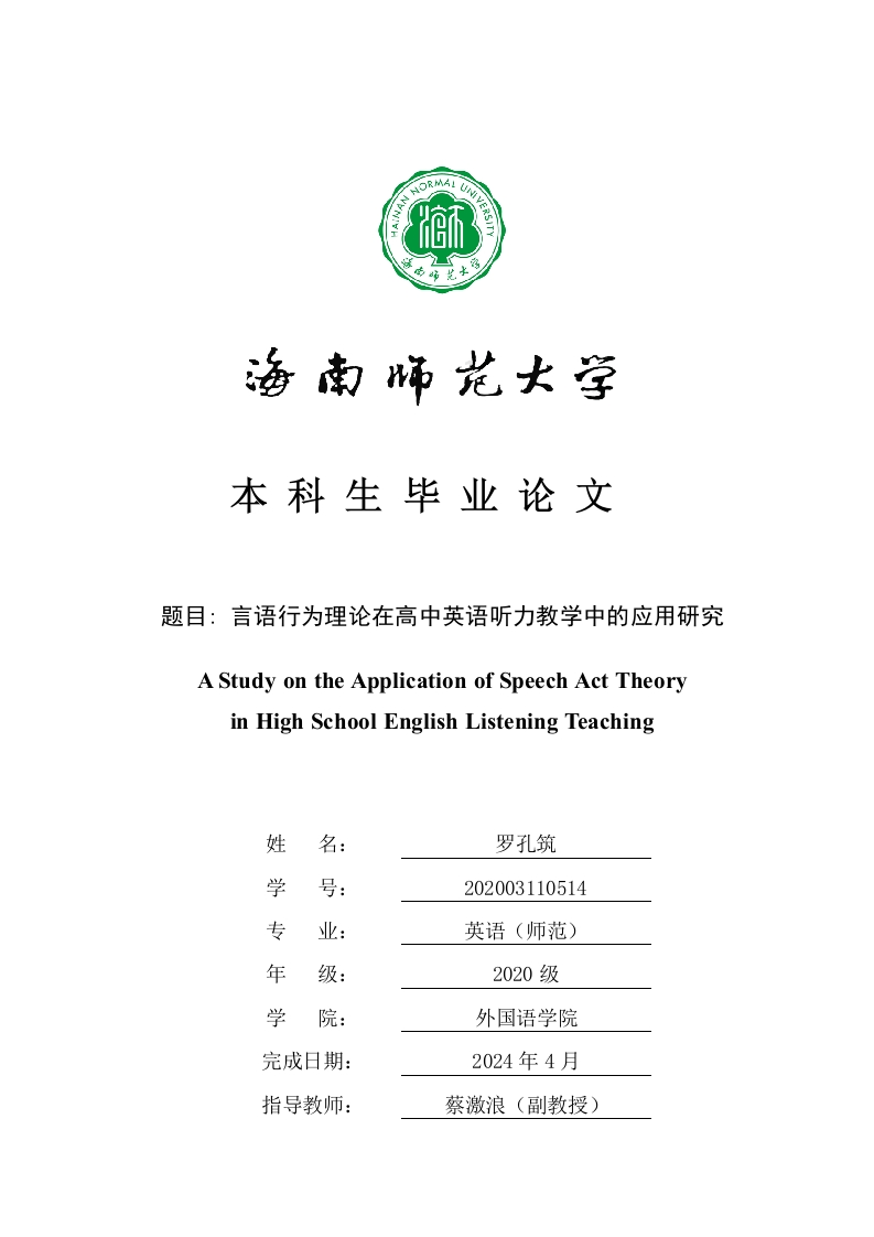 本科生毕业论文题目:言语行为理论在高中英语听力教学中的应用研究A Study on the Application of Speech Act Theoryin High School English Listening Teaching姓名:罗孔筑学号:202003110514专业:英语(师范)年级:2020级学院:外国语学院完成日期:2024年4月指导教师:蔡激浪(副教授)A Study on the Application of Speech ActTheory in High SchoolEnglish Listening TeachingA Thesis Submittedto Faculty of School of Foreign Languages,Hainan Normal Universityin Partial Fulfillment of the Requirementsfor the Degree of Bachelor of ArtsBy Luo KongzhuSupervisor:Cai Jilang (Associate Professor)March,2024本科生毕业论文独创性声明本人声明所呈交的毕业论文是本人在导师指导下进行的研究工作及取得的研究成果,除了文中特别加以标注和致谢的地方外,本论文中没有抄袭他人研究成果和伪造数据等行为。与我一同工作的同志对本研究所做的任何贡献均已在论文中作了明确的说明并表示谢意。论文作者签名:日期:2024年月日本科生毕业论文使用授权声明海南师范大学有权保留并向国家有关部门或机构送交毕业论文的复印件和磁盘,允许毕业论文被查阅和借阅。本人授权海南师范大学可以将本毕业论文的全部或部分内容编入有关数据库进行检索,可以采用影印、缩印或其他复印手段保存、汇编毕业论文。论文作者签名:日期:2024年月日指导教师签名:日期:2024年月日