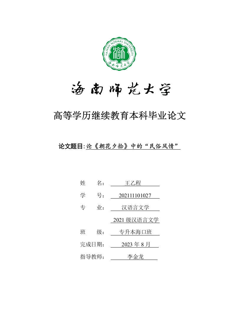 高等学历继续教育本科毕业论文论文题目:论《朝花夕拾》中的“民俗风情”姓名:王乙程学号:202111101027专业:汉语言文学2021级汉语言文学班级:专升本海口班完成日期:2023年8月指导教师:李金龙本科生毕业论文独创性声明本人声明所呈交的毕业论文是本人在导师指导下进行的研究工作及取得的研究成果,除了文中特别加以标注和致谢的地方外,本论文中没有抄袭他人研究成果和伪造数据等行为。与我一同工作的同志对本研究所做的任何贡献均已在论文中作了明确的说明并表示谢意。论文作者签名:日期:20年月日本科生毕业论文使用授权声明海南师范大学有权保留并向国家有关部门或机构送交毕业论文的复印件和磁盘,允许毕业论文被查阅和借阅。本人授权海南师范大学可以将本毕业论文的全部或部分内容编入有关数据库进行检索,可以采用影印、缩印或其他复印手段保存、汇编毕业论文。论文作者签名:日期:20年月日指导教师签名:日期:20年月日目录一、《朝花夕拾》的民间文化背景2(一)鲁迅成长的民俗文化环境2(二)鲁迅的民俗文化思想…51.《狗·猫·鼠》一一花纸文化.52.《五猖会》《无常》(二)病态的民俗61.《父亲的病》ー“名医”62.《二十四孝图》一一“孝”78(二)鲁迅《朝花夕拾》对民俗文化的感悟·10