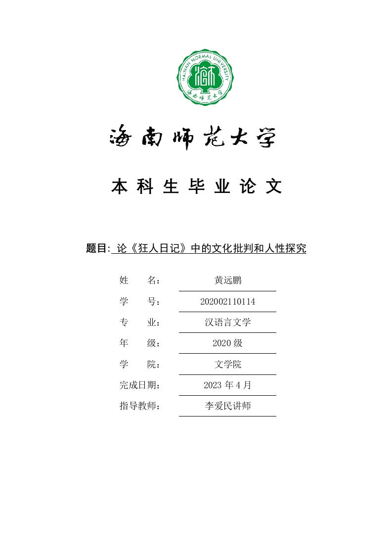 本科生毕业论文题目:论《狂人日记》中的文化批判和人性探究姓名:黄远鹏学号:202002110114专业:汉语言文学年级:2020级学院:文学院完成日期:2023年4月指导教师:李爱民讲师本科生毕业论文独创性声明本人声明所呈交的毕业论文是本人在导师指导下进行的研究工作及取得的研究成果,除了文中特别加以标注和致谢的地方外,本论文中没有抄袭他人研究成果和伪造数据等行为。与我一同工作的同志对本研究所做的任何贡献均已在论文中作了明确的说明并表示谢意。论文作者签名:日期:本科生毕业论文使用授权声明海南师范大学有权保留并向国家有关部门或机构送交毕业论文的复印件和磁盘,允许毕业论文被查阅和借阅。本人授权海南师范大学可以将本毕业论文的全部或部分内容编入有关数据库进行检索,可以采用影印、缩印或其他复印手段保存、汇编毕业论文。论文作者签名:日期:指导教师签名:日期:目录二、《狂人日记》的社会历史背景..6三、狂人的个体观察.7(一)狂人所处的社会背景以及其独特的思想行为特征…7(二)狂人视角下所揭示的当时中国社会的黑暗和无奈.8四、鲁迅以“革命民主自由”立场,对中国的文化进行了深刻批判.·9(一)对家族制度和礼教的批判..9(二)对封建文化的反思…10(三)对知识分子的批判.…10(四)对人类前途的担忧................。......11(五)对整个封建社会的批判..12五《狂人日记》中的人性探索...12(一)对人性的揭示…13(二)对人性的剖析…13(三)对人性的反思…14(四)对人性多样化的认识.…15(五)对人性的深层次的挖掘..15【参考文献】16致谢17