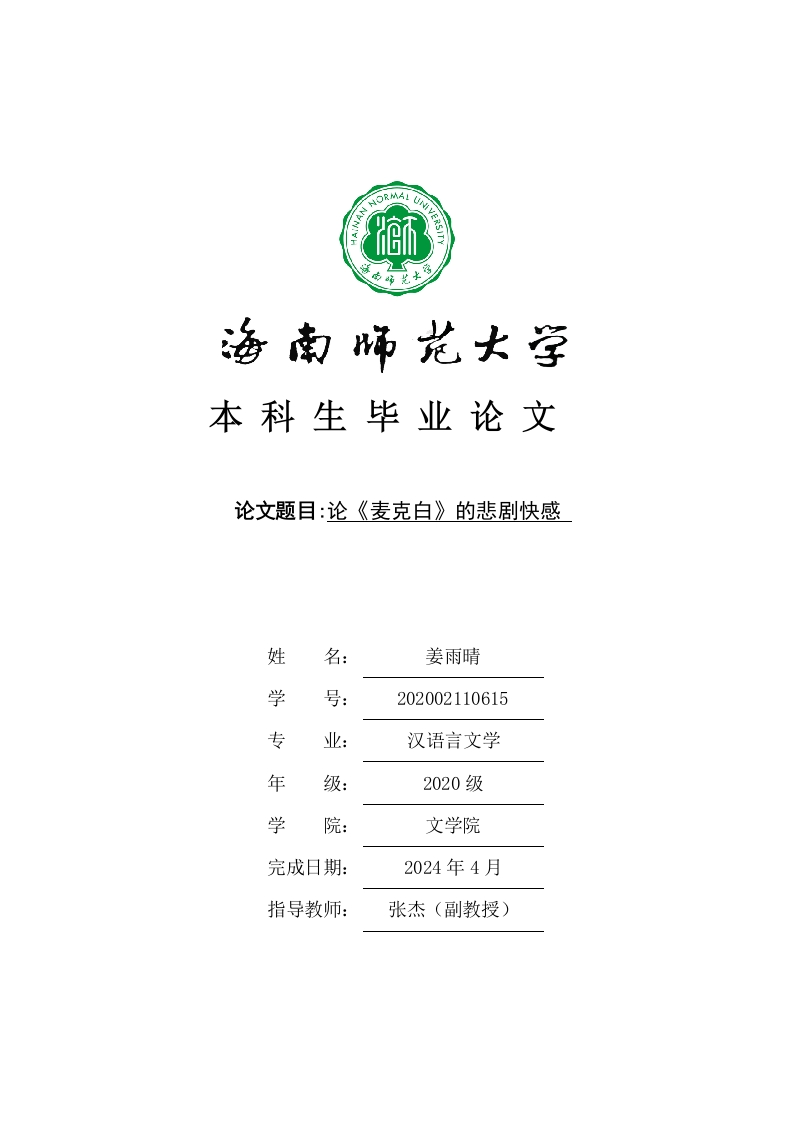 本科生毕业论文论文题目:论《麦克白》的悲剧快感姓名:姜雨晴学号:202002110615专汉语言文学年级:2020级学院:文学院完成日期:2024年4月指导教师:张杰(副教授)本科生毕业论文独创性声明本人声明所呈交的毕业论文是本人在导师指导下进行的研究工作及取得的研究成果,除了文中特别加以标注和致谢的地方外,本论文中没有抄袭他人研究成果和伪造数据等行为。与我一同工作的同志对本研究所做的任何贡献均已在论文中作了明确的说明并表示谢意。论文作者签名:日期:2024年月日本科生毕业论文使用授权声明海南师范大学有权保留并向国家有关部门或机构送交毕业论文的复印件和磁盘,允许毕业论文被查阅和借阅。本人授权海南师范大学可以将本毕业论文的全部或部分内容编入有关数据库进行检索,可以采用影印、缩印或其他复印手段保存、汇编毕业论文。论文作者签名:日期:2024年月日指导教师签名:日期:2024年月日目录一、西方学者的悲剧快感理论..3(一)亚里士多德论悲剧快感的功用3(二)尼采论“酒神精神”中的悲剧快感(三)布洛论审美的“心理距离”46(一)悲剧快感产生的前提条件(二)悲剧快感产生的情绪特征882.悲剧快感与怜悯和同情83.悲剧快感与恐惧和振奋..9(三)朱光潜对前人理论的发展...·10三、《麦克白》的悲刷快感.…12(一)《麦克白》悲剧快感的前提条件12(二)《麦克白》悲剧快感的产生原因13132.情节的冲突一一恐惧...14(三)《麦克白》悲剧快感的审美特征15152.旺盛的生命力..16181920