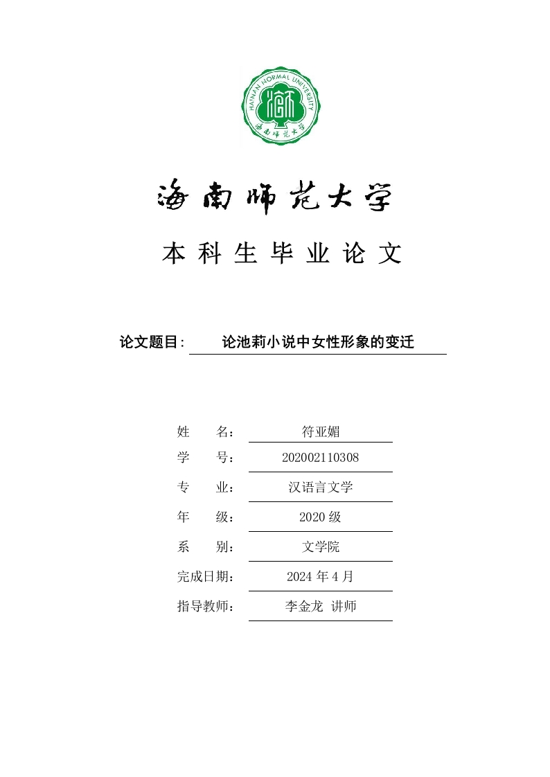 本科生毕业论文论文题目:论池莉小说中女性形象的变迁姓名:符亚媚学号:202002110308专业:汉语言文学年级:2020级系文学院完成日期:2024年4月指导教师:李金龙讲师本科生毕业论文(设计)独创性声明本人声明所呈交的毕业论文(设计)是本人在导师指导下进行的研究工作及取得的研究成果,除了文中特别加以标注和致谢的地方外,本论文中没有抄袭他人研究成果和伪造数据等行为。与我一同工作的同志对本研究所做的任何贡献均已在论文中作了明确的说明并表示谢意。论文作者签名:日期:20年月日本科生毕业论文(设计)使用授权声明海南师范大学有权保留并向国家有关部门或机构送交毕业论文(设计)的复印件和磁盘,允许毕业论文(设计)被查阅和借阅。本人授权海南师范大学可以将本毕业论文(设计)的全部或部分内容编入有关数据库进行检索,可以采用影印、缩印或其他复印手段保存、汇编毕业论文(设计)。论文作者签名:日期:20年月日指导教师签名:日期:20年月日目录1一、传统的贤良女性1(一)温良恭俭的美德坚守者(二)坚韧不屈的家庭守护者.3(三)无私奉献的守诺者…二、觉醒中反抗的女性…(一)挣脱命运枷锁的叛逆者,(二)反叛中的觉悟者…(三)醒悟的复仇者…三、独立奋斗的现代女性…7(一)独立自主的职场精英女性(二)刚毅要强的底层市民女性8(三)理性务实的现代知识女性9结语致谢…12