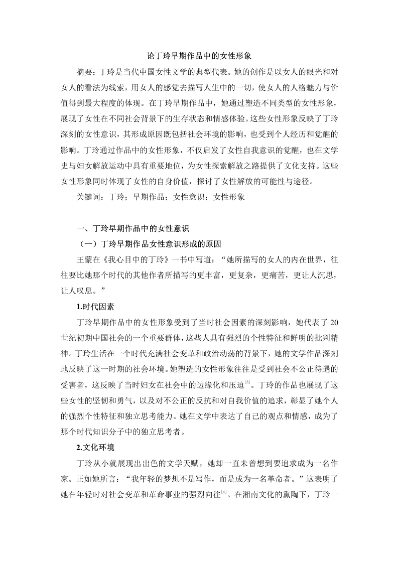 论丁玲早期作品中的女性形象摘要:丁玲是当代中国女性文学的典型代表。她的创作是以女人的眼光和对女人的看法为线索,用女人的感觉去描写人生中的一切,使女人的人格魅力与价值得到最大程度的体现。在丁玲早期作品中,她通过塑造不同类型的女性形象,展现了女性在不同社会背景下的生存状态和情感体验。这些女性形象反映了丁玲深刻的女性意识,其形成原因既包括社会环境的影响,也受到个人经历和觉醒的影响。丁玲通过作品中的女性形象,不仅启发了女性自我意识的觉醒,也在文学史与妇女解放运动中具有重要地位,为女性探索解放之路提供了文化支持。这些女性形象同时体现了女性的自身价值,探讨了女性解放的可能性与途径。关键词:丁玲:早期作品;女性意识:女性形象一、丁玲早期作品中的女性意识(一)丁玲早期作品女性意识形成的原因王蒙在《我心目中的丁玲》一书中写道:“她所描写的女人的内在世界,往往要比她那个时代的其他作者所描写的更丰富,更复杂,更痛苦,更让人沉思,让人叹息。”1.时代因素丁玲早期作品中的女性形象受到了当时社会因素的深刻影响,她代表了20世纪初期中国社会的一个重要群体,这些人具有强烈的个性特征和鲜明的批判精神。丁玲生活在一个时代充满社会变革和政治动荡的背景下,她的文学作品深刻地反映了这一时期的社会环境。她塑造的女性形象往往是受到社会不公正待遇的受害者,这反映了当时妇女在社会中的边缘化和压迫。丁玲的作品也展现了这些女性的坚韧和勇气,以及对不公正的反抗和对自我价值的追求,彰显了她个人的强烈个性特征和独立思考能力。她在文学中表达了自己的观点和情感,成为了那个时代知识分子中的独立思考者。2.文化环境丁玲从小就展现出出色的文学天赋,她却一直未曾想到要追求成为一名作家。正如她所言:“我年轻的梦想不是写作,而是成为一名革命者。”这表明了她在年轻时对社会变革和革命事业的强烈向往。在湘南文化的熏陶下,丁玲一开始就以积极的态度投身于文学创作,她的创作初衷是要通过文学来深刻地剖析这个世界,并关注女性问题。丁玲的家庭背景也对她的成长产生了深刻的影响。由于父亲早逝,她的母亲忙于工作,丁玲从小就依赖别人来照顾她。这种家庭环境可能使她更加敏感地关注了社会中弱势群体的问题,尤其是妇女的处境,这在她后来的文学作品中得以深刻反映。(二)丁玲早期作品女性意识的表现形式她的早期作品中,以女性形象作为主要描写对象,以一个内敛且具有女性气质和独立意识为主要表现手法同。丁玲的作品自始至终蕴含着一种感情,前期是一种在独特的社会环境下对自身、对女性处境的深刻体验,其中有一种很强的表达欲,倾诉欲。带着沉重的苦闷表达自己的寄托之情。1.核心女性人物的塑造丁玲第一次用真正的独立女性意识写作,第一次正视了女性自身的追求与渴望,对女性心理的描写更是丝丝入扣,她早期笔下的女性形象:梦珂、莎菲、伊萨等,她们有的孤独倨傲,有的外冷内热,有的失落悲观,有的迷惘彷徨,有的外柔内刚,有的坚忍不拔,有的执着勇敢,她们无一不在寻找自己的社会地位、作用和价值。在1927年出版的《小说月报》是丁玲首部以妇女为题材的小说一《梦珂》。由于当时这部小说的出版,这让这个文坛引起了轩然大波。丁玲在《梦珂》的影响力尚未消退之际,又一部短篇小说《莎菲女士的日记》很快的出版了。丁玲的一部成名作品一《莎菲女士的日记》。正是由于这两个短篇小说,让丁玲一举成名。2.女性姿态的个性表达丁玲早期作品中的女性形象呈现出直爽和自然的特点,她将自己看作一个独立的个体,拒绝了依附于男性的角色定位。然而,她并未将女性仅仅视为装饰品存在,而是通过对这些形象的改造和重塑,使她们更具个性,同时保持了美丽、大方、优雅和端庄。丁玲的文学作品中的女性形象经过改造和重构后,呈现出更加丰富的内在特质。她的女性角色不仅具备坚强和自立的品质,还展现出深刻的思考和内心的美丽⑧。这种改造让这些女性角色更具吸引力和个性,同时也更具有社会意义。她的作品中的女性形象不再局限于表面的直爽,而是在自然美的基础上融入了人本主义的精神,呈现出更加复杂和多维的特征。从个人角度来看,丁玲的作品并未刻意强调女性需要具备传统社会对温柔、善良、纯洁和可爱的刻板印象。相反,她将自然美与人本主义有机地结合在一起,通过她的文学作品深刻地反映了女性的内在世界和情感。二、丁玲早期作品中的不同类型女性形象(一)传统女性形象在整个接受文化教育的年代,传统女性形象得到了一定程度上的传播。但是从整体来看,丁玲并没有因为这些被大众认可和喜爱而获得巨大收益。她是一个身份地位较低、社会地位不高,甚至处于边缘化状态,但拥有极高文学素养却又有着伟大思想内涵,以及对艺术追求有独到见解,且能为外界所理解与欣赏并接受,这种“先天不足”导致了丁玲在人生道路中难以实现自我价值,也无法完成其创作使命和理想信念。1.乡村妇女形象丁玲是中国现代作家,她的作品着重描绘了女性在传统农村社会中的现实状况和悲惨命运,并以此唤醒乡村妇女的传统心灵©。她的小说《阿毛姑娘》尤为突出,通过主角阿毛的故事,深入探讨了农村女性的命运