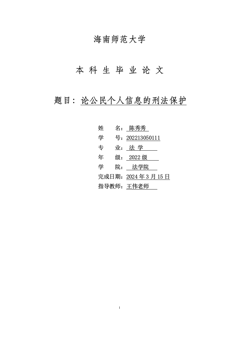 海南师范大学本科生毕业论文题目:论公民个人信息的刑法保护姓名:陈秀秀学号:202213050111专业:法学年级:2022级学法学院完成日期:2024年3月15日指导教师:王伟老师本科生毕业论文(设计)独创性声明本人声明所呈交的毕业论文(设计)是本人在导师指导下进行的研究工作及取得的研究成果,除了文中特别加以标注和致谢的地方外,本论文中没有抄袭他人研究成果和伪造数据等行为。与我一同工作的同志对本研究所做的任何贡献均已在论文中作了明确的说明并表示谢意论文(设计)作者签名:陈秀秀日期:2024年3月15日本科生毕业论文(设计)使用授权声明海南师范大学有权保留并向国家有关部门或机构送交毕业论文(设计)的复印件和磁盘,允许毕业论文(设计)被查阅和借阅。本人授权海南师范大学可以将本毕业论文(设计)的全部或部分内容编入有关数据库进行检索,可以采用影印、缩印或其他复印手段保存、汇编毕业论文(设计)。论文(设计)作者签名:陈秀秀日期:2024年3月15日指是教师签名:王伟日期:2024年3月15日摘要随着新时代的快速发展,公民个人信息开始作为一种特定的标识符号出现在大家的视野之中,各行各业对公民个人信息追求的欲望是极其强烈的,认为谁掌握了信息的主动权,那么谁就能够拥有话语权。当然,在对于合理正当的公民个人信息处理行为,这些都是无可厚非的,但是一旦出现不合理的侵犯公民个人信息行为,那么就会导致严重危害结果。现如今我国对公民个人信息的刑法保护是处于不断发展中的,但是直至今日仍然存在着许多不足之处,因此为了打击犯罪和保障人权,对公民个人信息刑法保护的深入研究就显得意义重大了。本文旨在探讨公民个人信息刑法保护的理论基础和局限性,并提出相应的完善措施。首先,我们阐述了公民个人信息的概念和刑法保护的必要性,强调了侵犯公民个人信息所带来的危害性和我国刑法在这方面的不足。其次,我们分析了刑法保护公民个人信息现状的局限性,包括对个人信息泄露的惩罚力度不足、法律界定不清晰、司法实践中定罪标准不统一以及缺乏有效的预防机制。在此基础上,我们提出了些改进措施,包括明确个人信息的具体范围、情节严重的标准以及加强普法宣传教育。最后,我们总结了本文的主要观点并感谢所有相关人员。关键词:刑法保护:公民个人信息:局限性:完善措施:个人保护意识ABSTRACTWith the development of the big data era,personal information of citizens has begunto appear as a specific identifier in everyone's vision.The desire for personalinformation of citizens in various industries is extremely strong,believing thatwhoever has the initiative to control information has the right to speak.For reasonableand legitimate processing of personal information by citizens,this is understandable,but once unreasonable infringement of personal information by citizens occurs,it canlead to serious harmful consequences.The criminal protection of personal informationof citizens in China is constantly developing,but there are still shortcomings to thisday.Therefore,in order to protect human rights and combat crime,in-depth researchon the criminal protection of personal information of citizens is of great significance.Keywords:Criminal law protection Personal information of citizensLimitations;Improve measures;Personal protection awareness