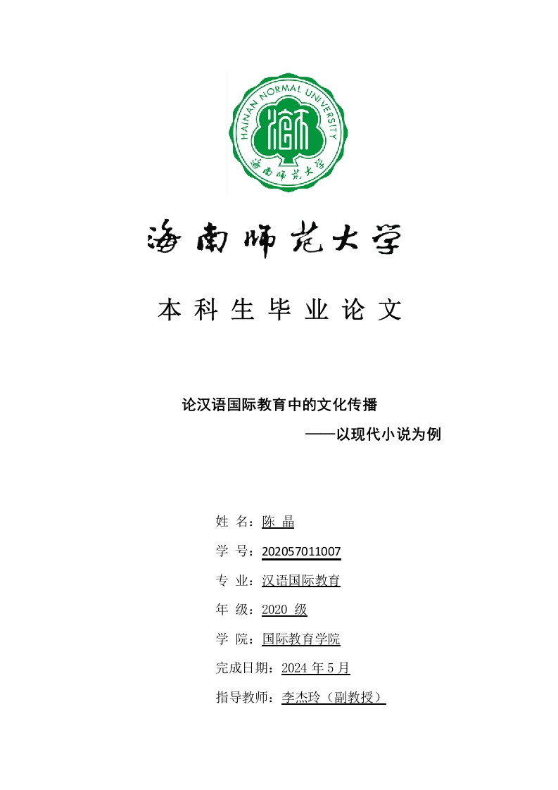 本科生毕业论文论汉语国际教育中的文化传播以现代小说为例姓名:陈晶学号:202057011007专业:汉语国际教育年级:2020级学院:国际教育学院完成日期:2024年5月指导教师:李杰玲(副教授)本科生毕业论文独创性声明本人声明所呈交的毕业论文是本人在导师指导下进行的研究工作及取得的研究成果,除了文中特别加以标注和致谢的地方外,本论文中没有抄袭他人研究成果和伪造数据等行为。与我一同工作的同志对本研究所做的任何贡献均已在论文中作了明确的说明并表示谢意。论文作者签名:日期:2024年4月19日本科生毕业论文使用授权声明海南师范大学有权保留并向国家有关部门或机构送交毕业论文的复印件和磁盘,允许毕业论文被查阅和借阅。本人授权海南师范大学可以将本毕业论文的全部或部分内容编入有关数据库进行检索,可以采用影印、缩印或其他复印手段保存、汇编毕业论文。论文作者签名:日期:2024年4月19日指导教师签名:日期:2024年4月19日