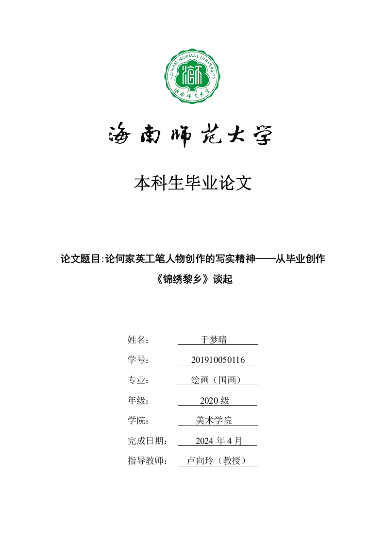 本科生毕业论文论文题目:论何家英工笔人物创作的写实精神一从毕业创作《锦绣黎乡》谈起姓名:于梦晴学号:201910050116专业:绘画(国画)年级:2020级学院:美术学院完成日期:2024年4月指导教师:卢向玲(教授)本科生毕业论文独创性声明本人声明所呈交的毕业论文是本人在导师指导下进行的研究工作及取得的研究成果,除了文中特别加以标注和致谢的地方外,本论文中没有抄袭他人研究成果和伪造数据等行为。与我一同工作的同志对本研究所做的任何贡献均已在论文中作了明确的说明并表示谢意。论文作者签名:日期:2024年4月18旦本科生毕业论文使用授权声明海南师范大学有权保留并向国家有关部门或机构送交毕业论文的复印件和磁盘,允许毕业论文被查阅和借阅。本人授权海南师范大学可以将本毕业论文的全部或部分内容编入有关数据库进行检索,可以采用影印、缩印或其他复印手段保存、汇编毕业论文。论文作者签名:日期:2024年4月18日指导教师签名:日期:2024年4月18日目录绪论1(一)研究背景…1(二)研究目的(三)研究方法21.文献研究法22.案例研究法23.实践研究法2一、工笔人物画中的精神3(一)精神内涵31.气韵…3.意境…(二)写实精神…6二、何家英工笔人物画写实精神的艺术表现8(一)色彩构成8(二)以线塑形9(三)技法创新(四)细节刻画…三、笔者创作实践分析12(一)创作背景…12(二)创作实践分析12