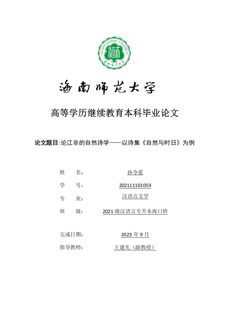 高等学历继续教育本科毕业论文论文题目:论江非的自然诗学一以诗集《自然与时日》为例姓名:孙令爱学号:202111101059专业:汉语言文学班级:2021级汉语言专升本海口班完成日期:2023年9月指导教师:王建光(副教授)本科生毕业论文独创性声明本人声明所呈交的毕业论文是本人在导师指导下进行的研究工作及取得的研究成果,除了文中特别加以标注和致谢的地方外,本论文中没有抄袭他人研究成果和伪造数据等行为。与我一同工作的同志对本研究所做的任何贡献均已在论文中作了明确的说明并表示谢意。论文作者签名:日期:2023年月日本科生毕业论文使用授权声明海南师范大学有权保留并向国家有关部门或机构送交毕业论文的复印件和磁盘,允许毕业论文被查阅和借阅。本人授权海南师范大学可以将本毕业论文的全部或部分内容编入有关数据库进行检索,可以采用影印、缩印或其他复印手段保存、汇编毕业论文。论文作者签名:日期:2023年月日指导教师签名:日期:2023年月日目录11一、自然与存在2(一)自然主义者之歌..2(二)自然的启示与人的存在3二、自然之心.5(二)良心和爱...(一)人作为说话者.·(二)语言和心灵的准则910参考文献…11致谢