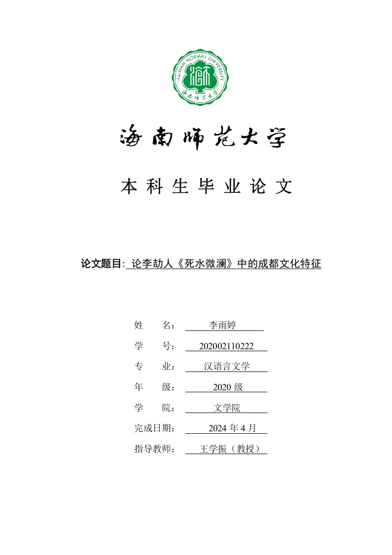 本科生毕业论文论文题目:论李劼人《死水微澜》中的成都文化特征姓名:李雨婷学号:202002110222专业:汉语言文学年级:2020级学院:文学院完成日期:2024年4月指导教师:王学振(教授)本科生毕业论文独创性声明本人声明所呈交的毕业论文是本人在导师指导下进行的研究工作及取得的研究成果,除了文中特别加以标注和致谢的地方外,本论文中没有抄袭他人研究成果和伪造数据等行为。与我一同工作的同志对本研究所做的任何贡献均已在论文中作了明确的说明并表示谢意。论文作者签名:日期:20年月日本科生毕业论文使用授权声明海南师范大学有权保留并向国家有关部门或机构送交毕业论文的复印件和磁盘,允许毕业论文被查阅和借阅。本人授权海南师范大学可以将本毕业论文的全部或部分内容编入有关数据库进行检索,可以采用影印、缩印或其他复印手段保存、汇编毕业论文。论文作者签名:日期:20年月日指导教师签名:日期:20年月日目录一、《死水微澜》中的成都生活(一)真实质朴的生活空间11.繁荣与质朴并存的天回镇...2.成都市井与天回镇的同构性..21.美食纷呈,注重滋味..·22.精细考究,注重品质3(三)热闹纷呈的成都民俗.·41.欢快喜庆的节日习俗45二、《死水微澜》中的川味人物..6(一)强悍泼辣的成女性形象61.不安现状,敢于追求,主动出击..72.性格刚烈,争强好胜,个性极强93.审时度势,率真坦然,聪明务实10111.褪去强势,软弱的“耙耳朵”形象1113141.率性而为的底色...1414三、《死水微澜》的川味叙述风格.·15152.“摆龙门阵”的叙述方法17171718(一)成都社会合理情节.·181.包容的社会氛围提供背景支撑182.安逸的民间民俗推动情节发展18191.人物性格彰显独特..1919
