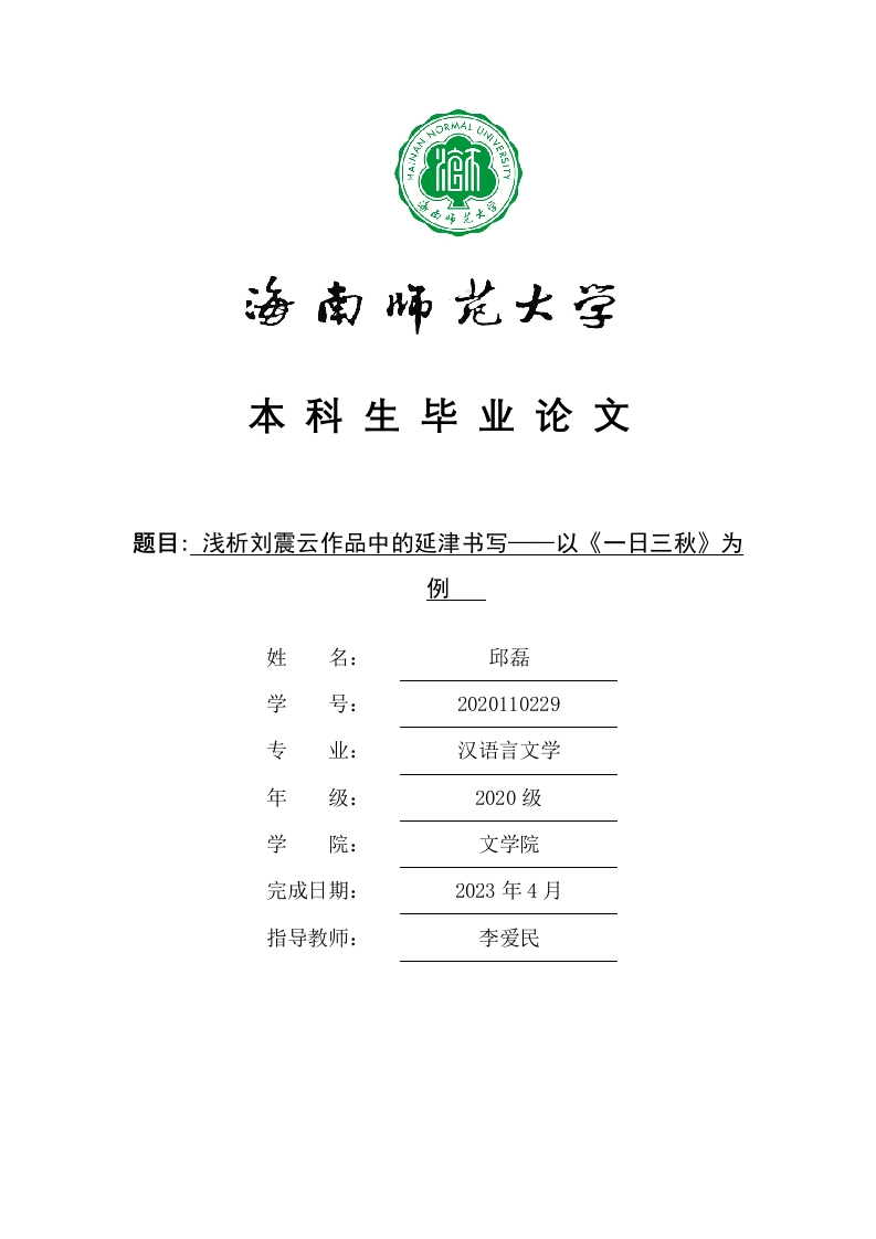 本科生毕业论文题目:浅析刘震云作品中的延津书写一以《一日三秋》为例姓名:邱磊学号:2020110229专业:汉语言文学年级:2020级学院:文学院完成日期:2023年4月指导教师:李爱民本科生毕业论文独创性声明本人声明所呈交的毕业论文是本人在导师指导下进行的研究工作及取得的研究成果,除了文中特别加以标注和致谢的地方外,本论文中没有抄袭他人研究成果和伪造数据等行为。与我一同工作的同志对本研究所做的任何贡献均已在论文中作了明确的说明并表示谢意。论文作者签名:日期:本科生毕业论文使用授权声明海南师范大学有权保留并向国家有关部门或机构送交毕业论文的复印件和磁盘,允许毕业论文被查阅和借阅。本人授权海南师范大学可以将本毕业论文的全部或部分内容编入有关数据库进行检索,可以采用影印、缩印或其他复印手段保存、汇编毕业论文。论文作者签名:日期:指导教师签名:日期:目录引言…1(一)“乡土书写”的传统1(二)“延津书写”及其独特性…1一、刘震云与延津书写的文学语境.2(一)中国传统文化、全球化以及现代化是如何影响延津书写的.2(二)创作背景和文学理念…2(三)延津是如何成为刘震云文学世界的重要载体的…二、《一日三秋》与延津书写的深度融合…4(一)《一日三秋》中的乡土描写(二)延津书写与社会变迁5(三)延津书写与人性探索6(四)延津书写与历史记忆…(五)延津书写与作品相互交织…三、延津书写的文化意义与哲学思考…7(一)延津书写的文化意义.(二)延津书写的哲学思考…8四、延津书写在当代文学中的位置与影响9五、结语9致谢…