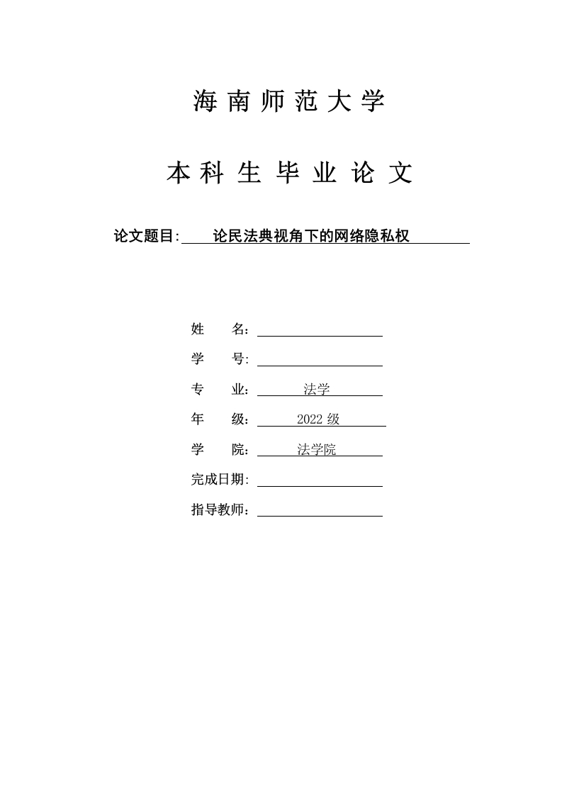 海南师范大学本科生毕业论文论文题目:论民法典视角下的网络隐私权姓名:学号:专法学年2022级学法学院完成日期:指导教师:本科生毕业论文(设计)独创性声明本人声明所呈交的毕业论文(设计)是本人在导师指导下进行的研究工作及取得的研究成果,除了文中特别加以标注和致谢的地方外,本论文中没有抄袭他人研究成果和伪造数据等行为。与我一同工作的同志对本研究所做的任何贡献均已在论文中作了明确的说明并表示谢意。论文(设计)作者签名:日期:本科生毕业论文(设计)使用授权声明海南师范大学有权保留并向国家有关部门或机构送交毕业论文(设计)的复印件和磁盘,允许毕业论文(设计)被查阅和借阅。本人授权海南师范大学可以将本毕业论文(设计)的全部或部分内容编入有关数据库进行检索,可以采用影印、缩印或其他复印手段保存、汇编毕业论文(设计)。论文(设计)作者签名:日期:指导教师签名:日期:目录目录AbStract..............................................................................................................................引言.1网络隐私权的概念.1(一)网络隐私权的概念界定…1(二)我国网络隐私权的新特点…22。侵权主体和手段的隐蔽性.33。侵权后果的严重性34.侵犯范围的广泛性.…二、我国网络隐私权保护现状分析…4(一)当前我国对于网络隐私权的保护4(二)举例说明…三、我国网络隐私权存在的问题(一)没有专门针对网络隐私权的法律法规..61.立法过于分散.62.隐私权定位不明确.…6(二)关于网络隐私的保护机制存在不足.(三)互联网行业自律机制不完善.7(四)我国公民网络隐私权保护意识薄弱四、完善网络隐私权法律保护的建议…9(一)建立我国的网络信息法律保护体系.9(二)建立规范的行业自律机制..10(三)健全网络隐私权的监管机制..11(四)提高网络隐私权保护意识…11五、结语…参考文献:.14