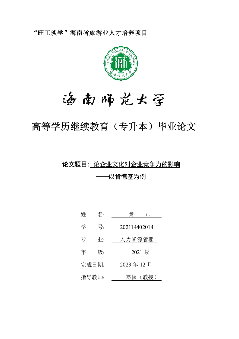 “旺工淡学”海南省旅游业人才培养项目高等学历继续教育(专升本)毕业论文论文题目:论企业文化对企业竞争力的影响一以肯德基为例姓名:黄山学202114402014专业:人力资源管理年2021级完成日期:2023年12月指导教师:高园(教授)本科生毕业论文独创性声明本人声明所呈交的毕业论文是本人在导师指导下进行的研究工作及取得的研究成果,除了文中特别加以标注和致谢的地方外,本论文中没有抄袭他人研究成果和伪造数据等行为。与我一同工作的同志对本研究所做的任何贡献均已在论文中作了明确的说明并表示谢意。论文作者签名:日期:20年月日本科生毕业论文使用授权声明海南师范大学有权保留并向国家有关部门或机构送交毕业论文的复印件和磁盘,允许毕业论文被查阅和借阅。本人授权海南师范大学可以将本毕业论文的全部或部分内容编入有关数据库进行检索,可以采用影印、缩印或其他复印手段保存、汇编毕业论文。论文作者签名:日期:20年月日指导教师签名:日期:20年月日目录一、企业文化与企业竞争力概述……2(一)企业文化的内涵及其构成…2(二)企业竞争力内涵与构成要素…2(三)企业文化对企业竞争力的影响…4二、肯德基企业文化的核心内容…4(一)肯德基的标准化服务和标准化建设(二)员工关怀和发展…(三)创新和特续改进……5(四)客户导向和服务质量……5(五)社会责任和可持续发展……5三、肯德基企业文化对其竞争力的影响…(一)对员工价值观的影响…(二)对顾客体验的影响…6(三)对品牌形象的影响…7四、当前企业文化建设面临的难题…9(一)沟通和合作不畅……9(二)价值观和信念缺失…(三)缺乏有效的激励和奖励机制……9(四)管理层的不正确引领…五、构建提升企业竞争力的企业文化策略…9