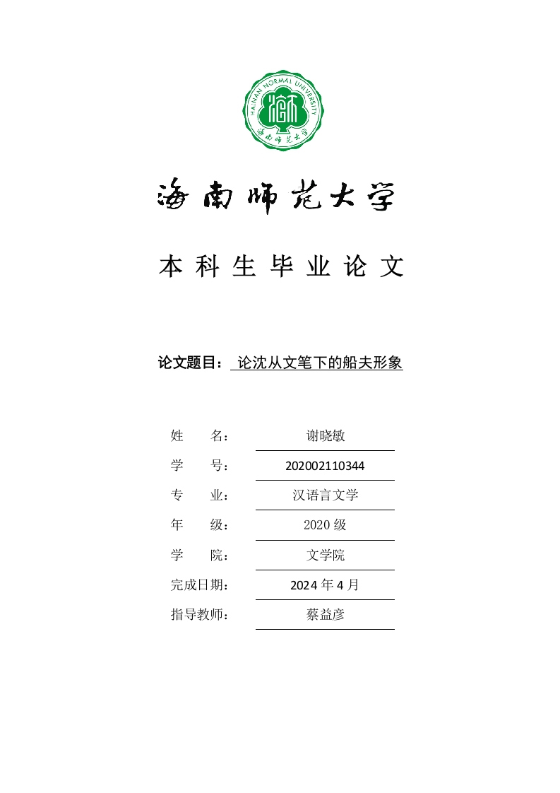 本科生毕业论文论文题目:论沈从文笔下的船夫形象姓名:谢晓敏学号:202002110344专业:汉语言文学年级:2020级学院:文学院完成日期:2024年4月指导教师:蔡益彦本科生毕业论文独创性声明本人声明所呈交的毕业论文是本人在导师指导下进行的研究工作及取得的研究成果,除了文中特别加以标注和致谢的地方外,本论文中没有抄袭他人研究成果和伪造数据等行为。与我一同工作的同志对本研究所做的任何贡献均已在论文中作了明确的说明并表示谢意。论文作者签名:日期:20年月旦本科生毕业论文使用授权声明海南师范大学有权保留并向国家有关部门或机构送交毕业论文的复印件和磁盘,允许毕业论文被查阅和借阅。本人授权海南师范大学可以将本毕业论文的全部或部分内容编入有关数据库进行检索,可以采用影印、缩印或其他复印手段保存、汇编毕业论文。论文作者签名:日期:20年月旦指导教师签名:日期:20年月日目录绪论一、船夫形象特征.·(二)交易下的淳朴真情…2(三)为生存所困的底层色彩浓郁333、用粗俚语来发泄心中压力..4(一)现代文明冲击下的人性堕落..5(三)崇尚人性的文学创作观(四)受废名创作风格的影响…7三、船夫形象的意义……8(一)构建“真”善美湘西世界..8(二)影响汪曾祺的创作.·91112