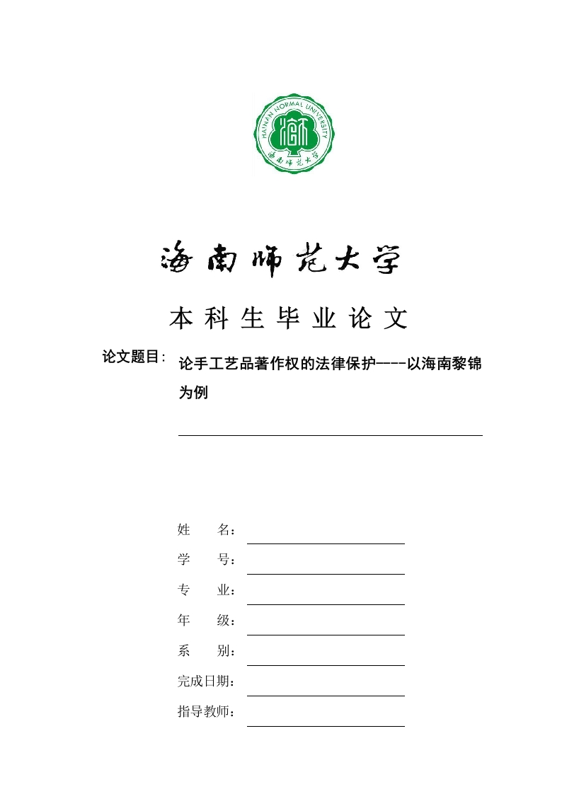 本科生毕业论文论文题目:论手工艺品著作权的法律保护一-一以海南黎锦为例姓名:学专业:年级:系完成日期:指导教师:本科生毕业论文(设计)独创性声明本人声明所呈交的毕业论文(设计)是本人在导师指导下进行的研究工作及取得的研究成果,除了文中特别加以标注和致谢的地方外,本论文中没有抄袭他人研究成果和伪造数据等行为。与我一同工作的同志对本研究所做的任何贡献均已在论文中作了明确的说明并表示谢意。论文作者签名:日期:年月日本科生毕业论文(设计)使用授权声明海南师范大学有权保留并向国家有关部门或机构送交毕业论文(设计)的复印件和磁盘,允许毕业论文(设计)被查阅和借阅。本人授权海南师范大学可以将本毕业论文(设计)的全部或部分内容编入有关数据库进行检索,可以采用影印、缩印或其他复印手段保存、汇编毕业论文(设计)。论文作者签名:日期:年月日指导教师签名:日期:年月目录目录摘要…Abstat…........................................l引言…1一、手工艺品的概念…1(二)手工艺品的特征…21、具有群体性和创作性2、具有鲜明的民族性.…23、典型的原生态…(三)黎锦的特征1、图案32、制作工艺二、手工艺品的相关立法及保护现状..3(一)国家立法1、《传统工艺美术保护条例》32、《非物质文化遗产保护法》.4(二)注重行政保护,缺少私法救济5(三)缺少后人技艺传承,传承意识及创新创业方式薄弱.7(四)忽视作品保护,维权问题难以保障…(五)来源群体难以确定、侵权行为判定标准模糊.81、独创性的认定标准.82、表达形式的认定标准…(六)版权权利期限较短,过其限期就流入公共区域9三、手工艺品著作权的法律保护以黎锦为例的建议对策..10(一)构建行政法律保护及个人权益救济相结合模式101.