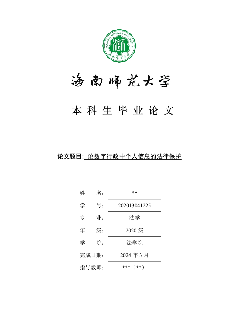 本科生毕业论文论文题目:论数字行政中个人信息的法律保护姓名:学号:202013041225专业:法学年级:2020级学院:法学院完成日期:2024年3月指导教师:本科生毕业论文独创性声明本人声明所呈交的毕业论文是本人在导师指导下进行的研究工作及取得的研究成果,除了文中特别加以标注和致谢的地方外,本论文中没有抄袭他人研究成果和伪造数据等行为。与我一同工作的同志对本研究所做的任何贡献均已在论文中作了明确的说明并表示谢意。论文作者签名:日期:20年月日本科生毕业论文使用授权声明海南师范大学有权保留并向国家有关部门或机构送交毕业论文的复印件和磁盘,允许毕业论文被查阅和借阅。本人授权海南师范大学可以将本毕业论文的全部或部分内容编入有关数据库进行检索,可以采用影印、缩印或其他复印手段保存、汇编毕业论文。论文作者签名:日期:20年月日指导教师签名:日期:20年月日目录引言一、数字行政中个人信息保护概述(一)个人信息的界定....(二)个人信息的属性..(三)数字行政中个人信息的范围..··(四)数字行政中个人信息保护的特性二、数字行政中个人信息保护的正当性分析5(一)数字行政中个人信息保护的必要性3.有助于促使政府规制行为的正当化..·(二)数字行政中个人信息保护的基本原则..67三、我国数字行政中个人信息保护法律制度现状分析2.个人信息使用规范性不足..3.风险规制手段的有限性....10四、完善数字行政中个人信息法律保护的路径(一)强化数字行政领域的个人信息保护立法