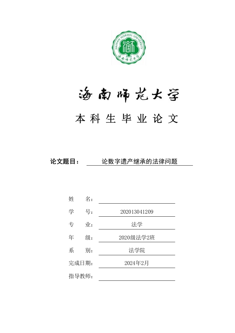 本科生毕业论文论文题目:论数字遗产继承的法律问题姓名:学号:202013041209专业:法学年级:2020级法学2班系法学院完成日期:2024年2月指导教师:本科生毕业论文(设计)独创性声明本人声明所呈交的毕业论文(设计)是本人在导师指导下进行的研究工作及取得的研究成果,除了文中特别加以标注和致谢的地方外,本论文中没有抄袭他人研究成果和伪造数据等行为。与我一同工作的同志对本研究所做的任何贡献均已在论文中作了明确的说明并表示谢意。论文作者签名:日期:20年月日本科生毕业论文(设计)使用授权声明海南师范大学有权保留并向国家有关部门或机构送交毕业论文(设计)的复印件和磁盘,允许毕业论文(设计)被查阅和借阅。本人授权海南师范大学可以将本毕业论文(设计)的全部或部分内容编入有关数据库进行检索,可以采用影印、缩印或其他复印手段保存、汇编毕业论文(设计)。论文作者签名:日期:20年月日指导教师签名:日期:20年月日目录一、数字遗产概述1(一)数字遗产的概念与特征1.数字遗产的概念2.数字遗产的特征2(二)数字遗产的分类..(三)数字遗产的法律属性3.新型财产权说6二、我国数字遗产继承的法律困境.·(一)数字遗产继承问题的立法缺陷(二)数字遗产的主客体界定不清...(三)数字遗产继承与隐私权保护冲突.·三、国外数字遗产继承法律制度的考察(一)德国数字遗产继承法律制度1.德国对数字遗产的界定.....2.数字遗产的法律属性之争3.数字遗产继承的预防服务11(二)美国数字遗产继承法律制度1.美国司法实践中的数字遗产继承纠纷一一艾斯沃斯诉雅虎案......112.美国的数字遗产获取制度...123.美国数字遗产继承的技术实现路径....1213四、我国数字遗产继承法律制度的完善建议·1314(三)平衡数字遗产继承与隐私权保护的利益冲突..16