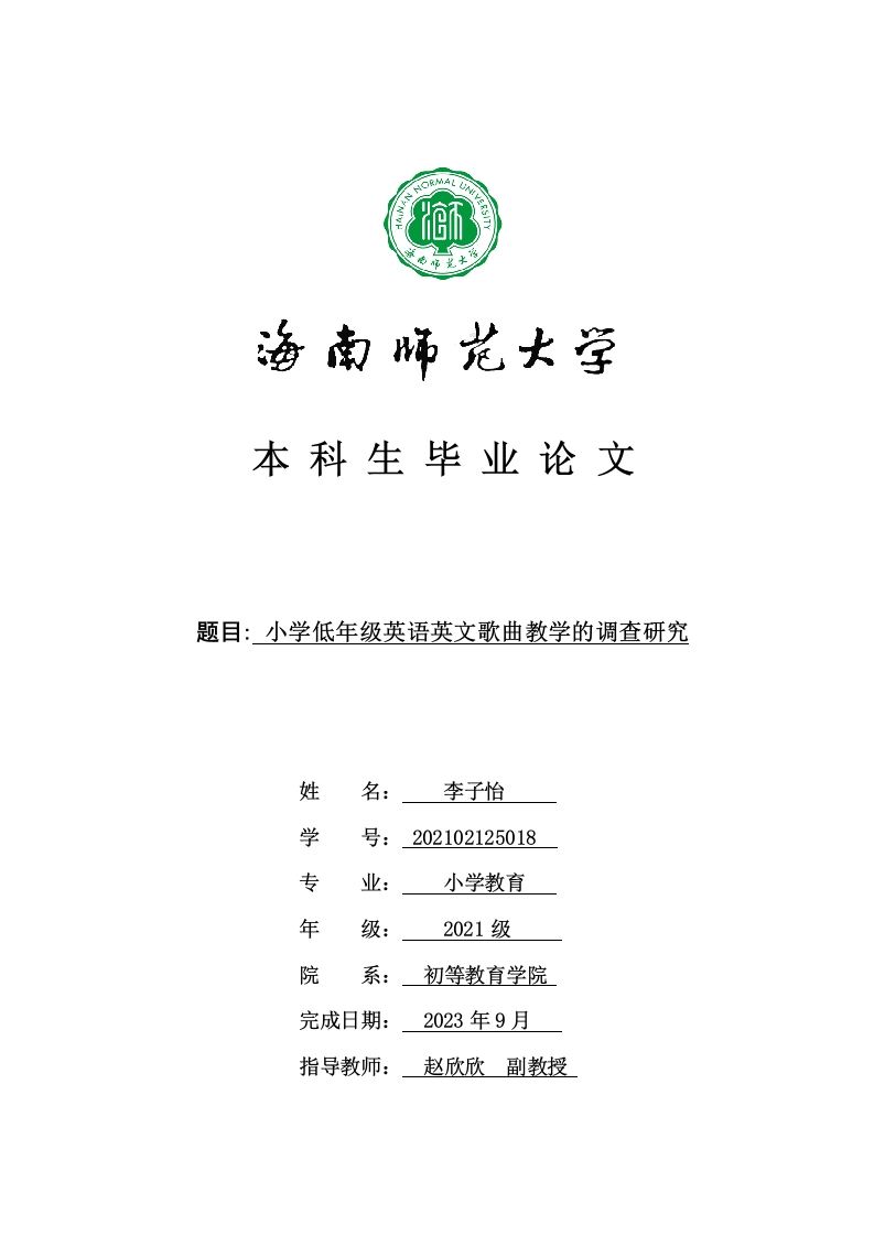 本科生毕业论文题目:小学低年级英语英文歌曲教学的调查研究姓名:李子怡学号:202102125018业:小学教育年级:2021级院系:初等教育学院完成日期:2023年9月指导教师:赵欣欣副教授本科生毕业论文独创性声明本人声明所呈交的毕业论文是本人在导师指导下进行的研究工作及取得的研究成果,除了文中特别加以标注和致谢的地方外,本论文中没有抄袭他人研究成果和伪造数据等行为。与我一同工作的同志对本研究所做的任何贡献均已在论文中作了明确的说明并表示谢意。论文作者签名:李子怡日期:2023年9月23日本科生毕业论文使用授权声明海南师范大学有权保留并向国家有关部门或机构送交毕业论文的复印件和磁盘,允许毕业论文被查阅和借阅。本人授权海南师范大学可以将本毕业论文的全部或部分内容编入有关数据库进行检索,可以采用影印、缩印或其他复印手段保存、汇编毕业论文。论文作者签名:李子怡日期:2023年9月23日指导教师签名:日期:20年月日目录(一)研究背景(二)研究意义(三)研究方法.21.问卷调查法2.访谈法2(四)相关概念界定1.英语歌曲…2.教学3一、小学低年级英语歌曲教学实施的现状调查3(一)问卷调查和设计的实施3(二)小学低年级英语歌曲歌谣教学现状31.教师的基本情况…32.对英语歌曲的认识和态度3.教师对教材英语歌曲的理解54.英语歌曲教学具体实施状况55.教师对教学所存问题的的认知…6.学生基本情况.87.学生对英语歌曲的认识和态度88.学生的掌握情况