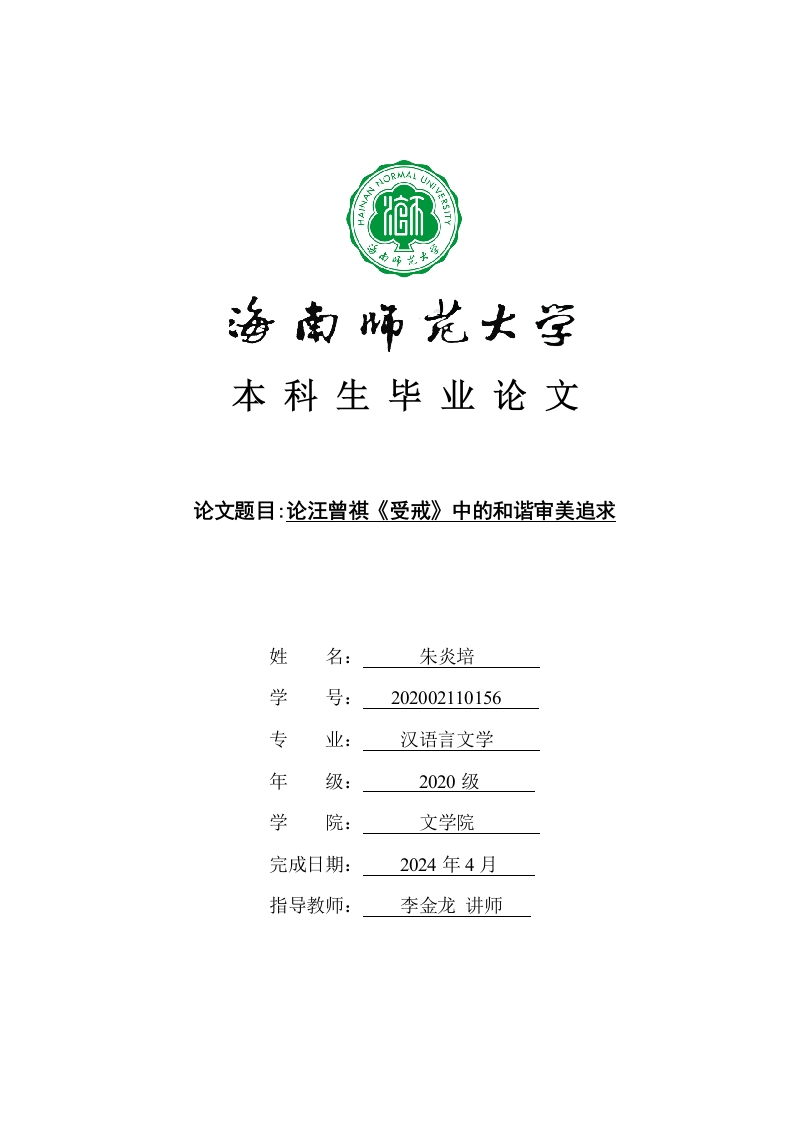 本科生毕业论文论文题目:论汪曾祺《受戒》中的和谐审美追求姓名:朱炎培学号:202002110156专汉语言文学年级:2020级学文学院完成日期:2024年4月指导教师:李金龙讲师本科生毕业论文独创性声明本人声明所呈交的毕业论文是本人在导师指导下进行的研究工作及取得的研究成果,除了文中特别加以标注和致谢的地方外,本论文中没有抄袭他人研究成果和伪造数据等行为。与我一同工作的同志对本研究所做的任何贡献均已在论文中作了明确的说明并表示谢意。论文作者签名:日期:20年月日本科生毕业论文使用授权声明海南师范大学有权保留并向国家有关部门或机构送交毕业论文的复印件和磁盘,允许毕业论文被查阅和借阅。本人授权海南师范大学可以将本毕业论文的全部或部分内容编入有关数据库进行检索,可以采用影印、缩印或其他复印手段保存、汇编毕业论文。论文作者签名:日期:20年月日指导教师签名:日期:20年月日目录引言(一)选题依据(二)研究意义1.理论意义2.现实意义(三)选题的研究现状…2一、和谐审美的涵义及来源.….3(二)来源…二、和谐审美追求的表现…(一)宗教和尘世的和谐(二)人物与自然环境的和谐7三、和谐审美追求的意义和影响(一)创作层面(二)文学文化史层面.10四、结语参考文献.12