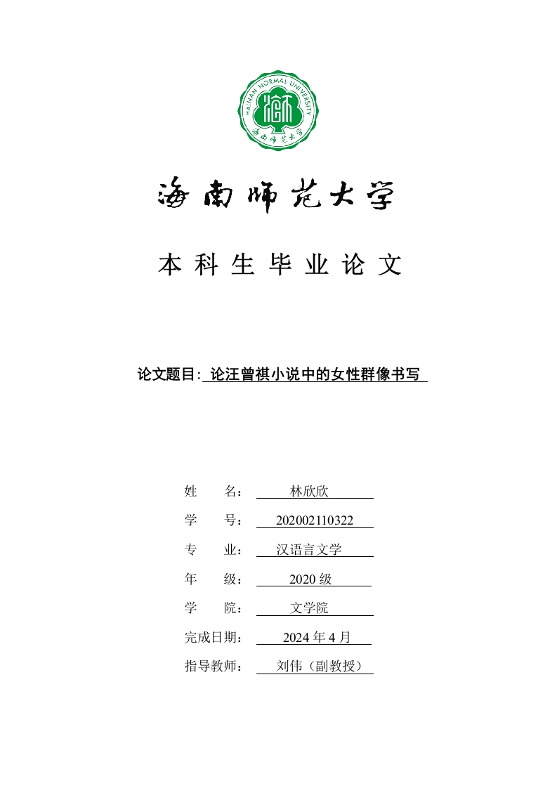 本科生毕业论文论文题目:论汪曾祺小说中的女性群像书写姓名:林欣欣学号:202002110322专汉语言文学年级:2020级学院:文学院完成日期:2024年4月指导教师:刘伟(副教授)本科生毕业论文独创性声明本人声明所呈交的毕业论文是本人在导师指导下进行的研究工作及取得的研究成果,除了文中特别加以标注和致谢的地方外,本论文中没有抄袭他人研究成果和伪造数据等行为。与我一同工作的同志对本研究所做的任何贡献均已在论文中作了明确的说明并表示谢意。论文作者签名:日期:20年月日本科生毕业论文使用授权声明海南师范大学有权保留并向国家有关部门或机构送交毕业论文的复印件和磁盘,允许毕业论文被查阅和借阅。本人授权海南师范大学可以将本毕业论文的全部或部分内容编入有关数据库进行检索,可以采用影印、缩印或其他复印手段保存、汇编毕业论文。论文作者签名:日期:20年月日指导教师签名:日期:20年月日目录引言…1(一)清灵坚韧的自然女性2(二)封建礼教下的“挣扎者”3二.女性形象书写的艺术特色...(一)“气氛即人物”789111214