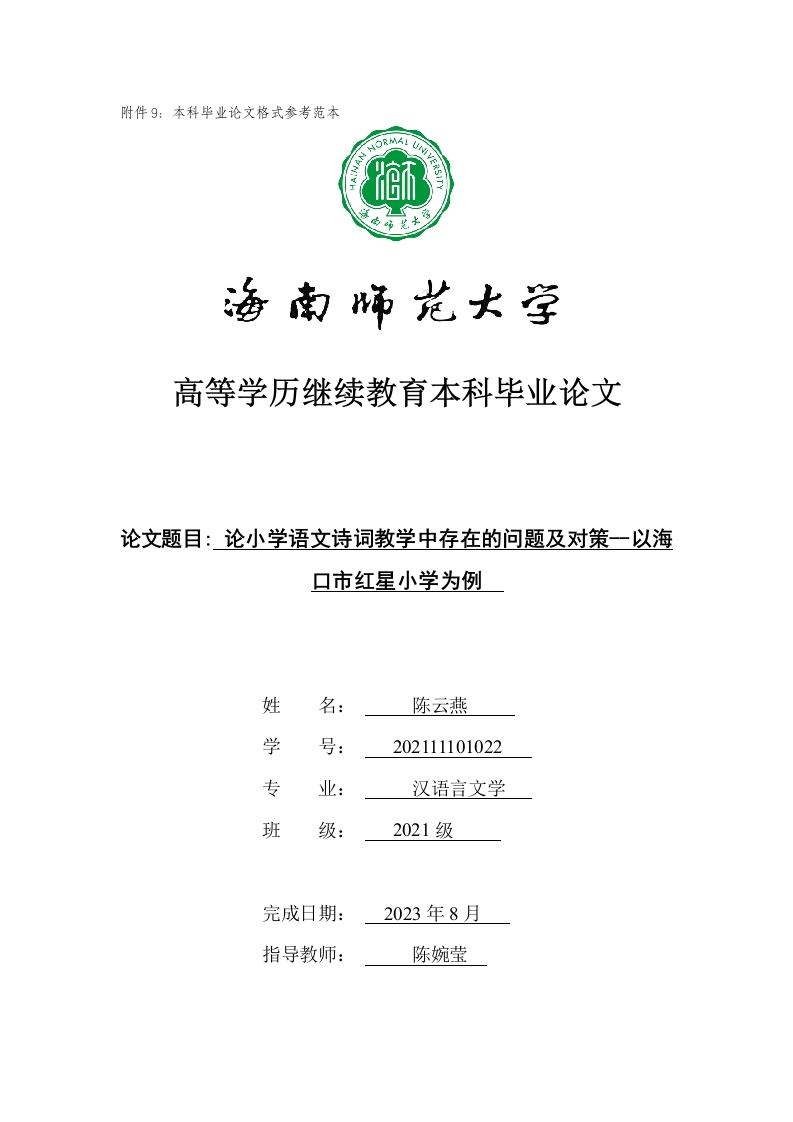 附件9:本科毕业论文格式参考范本高等学历继续教育本科毕业论文论文题目:论小学语文诗词教学中存在的问题及对策一以海口市红星小学为例姓名:陈云燕学号:202111101022专业:汉语言文学班级:2021级完成日期:2023年8月指导教师:陈婉莹本科生毕业论文独创性声明本人声明所呈交的毕业论文是本人在导师指导下进行的研究工作及取得的研究成果,除了文中特别加以标注和致谢的地方外,本论文中没有抄袭他人研究成果和伪造数据等行为。与我一同工作的同志对本研究所做的任何贡献均已在论文中作了明确的说明并表示谢意。论文作者签名:日期:20年月日本科生毕业论文使用授权声明海南师范大学有权保留并向国家有关部门或机构送交毕业论文的复印件和磁盘,允许毕业论文被查阅和借阅。本人授权海南师范大学可以将本毕业论文的全部或部分内容编入有关数据库进行检索,可以采用影印、缩印或其他复印手段保存、汇编毕业论文。论文作者签名:日期:20年月日指导教师签名:日期:20年月日摘要当前,古诗词课堂教学不容乐观,面临的问题也是多种多样的。多数学习者普遍对诗意掌握不精准,常常只能机械的记忆和练习,因此,古诗词教学应当受到重视。在研究古诗词教学中存在的问题时,采用采访和调研问卷等多种形式,对海口市红星学校小学语文古诗词课堂教学状况作了调研,分析总结出红星学校小学语文古诗词课堂教学中存在教学方法单一、缺乏学习兴趣等问题,并就课堂教学状况提出加大教学能力培训力度、提升教学水平、注重培养学生的学习兴趣等建议。关键词:小学语文;古诗词:教学现状ABSTRACTAt present,the classroom teaching of ancient poetry is not optimistic,and the problems it faces are also various.Most learners generally havean inaccurate grasp of poetry and can only memorize and practice itmechanically.Therefore,the teaching of ancient poetry should be paidmore attention to.When studying the problems existing in the teachingof ancient poetry,By means of interviews,questionnaires and other forms,this paper investigates the teaching status of ancient Chinese poetry inthe primary school of Haikou Red Star School,analyzes and summarizes theproblems such as single teaching method and lack of learning interest inthe classroom teaching of ancient Chinese poetry in the primary schoolof Red Star School,and proposes to strengthen teaching ability training,improve teaching level and pay attention to cultivating students'learning interest And other suggestions.Key words:primary school Chinese;Ancient poetry;Teaching status