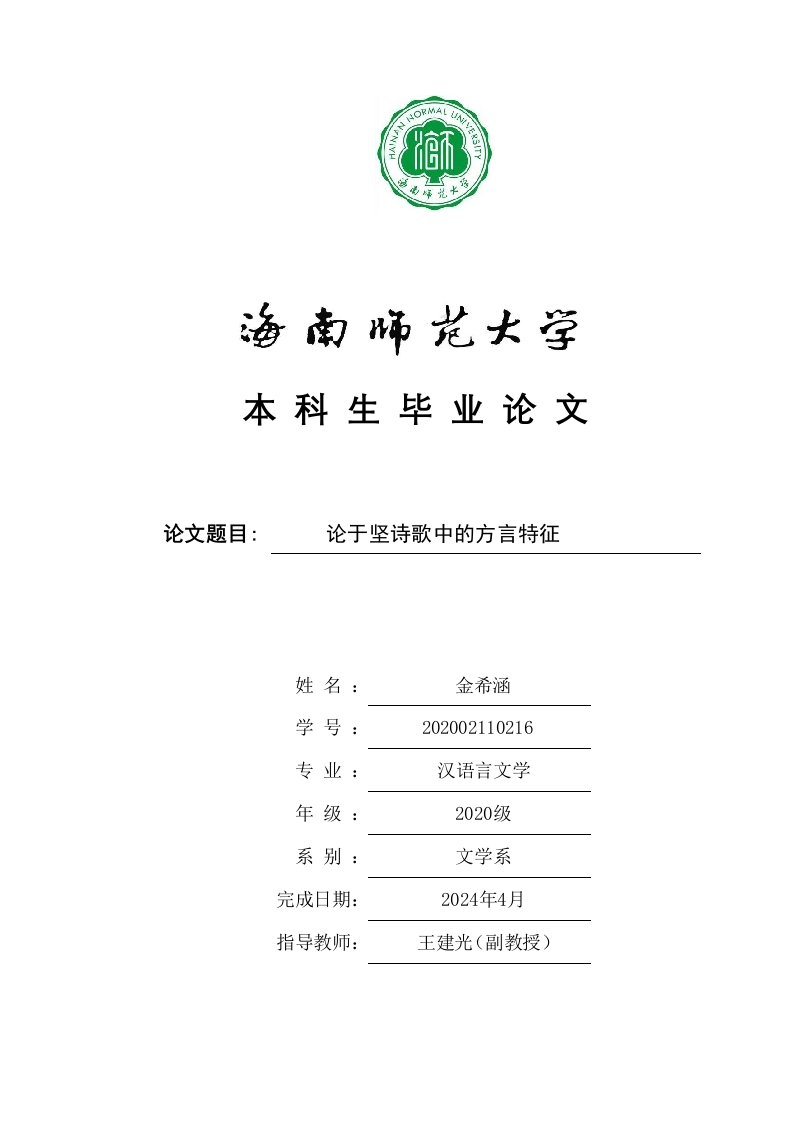 本科生毕业论文论文题目:论于坚诗歌中的方言特征姓名:金希涵202002110216专业:汉语言文学年级:2020级系别:文学系完成日期:2024年4月指导教师:王建光(副教授)本科生毕业论文(设计)独创性声明本人声明所呈交的毕业论文(设计)是本人在导师指导下进行的研究工作及取得的研究成果,除了文中特别加以标注和致谢的地方外,本论文中没有抄袭他人研究成果和伪造数据等行为。与我一同工作的同志对本研究所做的任何贡献均已在论文中作了明确的说明并表示谢意。论文作者签名:日期:20年月日本科生毕业论文(设计)使用授权声明海南师范大学有权保留并向国家有关部门或机构送交毕业论文(设计)的复印件和磁盘,允许毕业论文(设计)被查阅和借阅。本人授权海南师范大学可以将本毕业论文(设计)的全部或部分内容编入有关数据库进行检索,可以采用影印、缩印或其他复印手段保存、汇编毕业论文(设计)。论文作者签名:日期:20年月日指导教师签名:日期:20年月日目录一、方言表现形式.·1(一)音、韵、词等方面的方言特征1(二)方言形式的艺术表现力.....24(一)方言语感的具体表现45三、方言特征与文化认同.…6(一)语言反映内心一一“在家园中发现世界”6(二)诗歌中蕴含的方言特征一一绽放的生命之花…89参考文献…11