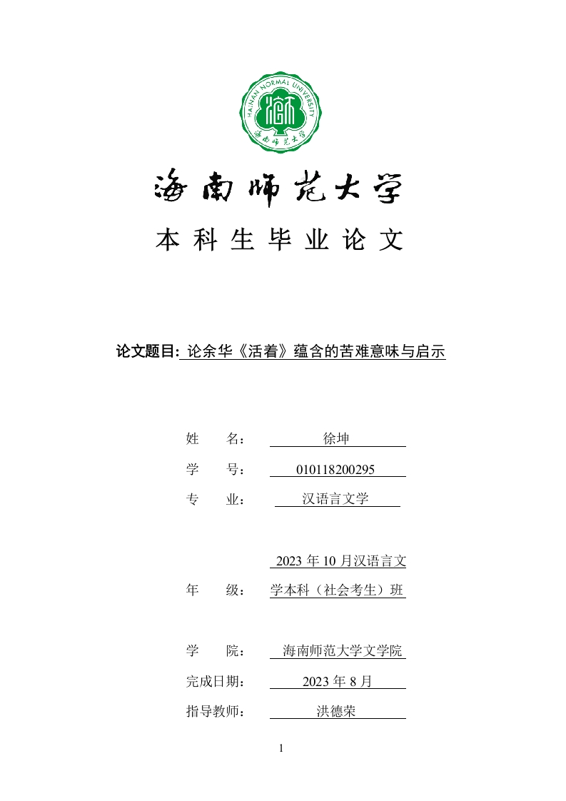 本科生毕业论文论文题目:论余华《活着》蕴含的苦难意味与启示姓名:徐坤学号:010118200295专业汉语言文学2023年10月汉语言文年级:学本科(社会考生)班学海南师范大学文学院完成日期:2023年8月指导教师:洪德荣本科生毕业论文独创性声明本人声明所呈交的毕业论文是本人在导师指导下进行的研究工作及取得的研究成果,除了文中特别加以标注和致谢的地方外,本论文中没有抄袭他人研究成果和伪造数据等行为。与笔者一同工作的同志对本研究所做的任何贡献均已在论文中作了明确的说明并表示谢意。论文作者签名:日期:20年月日本科生毕业论文使用授权声明海南师范大学有权保留并向国家有关部门或机构送交毕业论文的复印件和磁盘,允许毕业论文被查阅和借阅。本人授权海南师范大学可以将本毕业论文的全部或部分内容编入有关数据库进行检索,可以采用影印、缩印或其他复印手段保存、汇编毕业论文。论文作者签名:日期:20年月日指导教师签名:日期:20年月日2目录21.1研究背景....2352.1社会政治背景与历史动荡..52.2个人生活选择与道德观念.·673《活着》的苦难书写的深刻内涵和启示...·83.1《活着》的苦难书写的深刻内涵....83.1.1借助乐观及幽默抵抗苦难....83.1.3借助善良及真情超越苦难.........93.2《活着》的苦难启示...913143