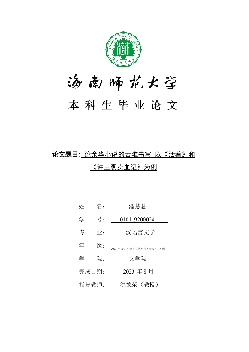 本科生毕业论文论文题目:论余华小说的苦难书写-以《活着》和《许三观卖血记》为例姓名:潘慧慧学号:010119200024专业:汉语言文学年级:223年10月汉语言文学本科〔社会考生)班学文学院完成日期:2023年8月指导教师:洪德荣(教授)本科生毕业论文独创性声明本人声明所呈交的毕业论文是本人在导师指导下进行的研究工作及取得的研究成果,除了文中特别加以标注和致谢的地方外,本论文中没有抄袭他人研究成果和伪造数据等行为。与我一同工作的同志对本研究所做的任何贡献均已在论文中作了明确的说明并表示谢意。论文作者签名:潘慧慧日期:2023年8月11日本科生毕业论文使用授权声明海南师范大学有权保留并向国家有关部门或机构送交毕业论文的复印件和磁盘,允许毕业论文被查阅和借阅。本人授权海南师范大学可以将本毕业论文的全部或部分内容编入有关数据库进行检索,可以采用影印、缩印或其他复印手段保存、汇编毕业论文。论文作者签名:潘慧慧日期:2023年8月11日指导教师签名:日期:20年月日目录2苦难在文本中的具体表现22.2战争的威胁...22.3“死亡”343.1作者自身经历的影响...3.2作者创作观念的转变54.1“话语”淡化苦难.·.5苦难书写的价值.....85.1苦难中的乐观心态...85.2生存挣扎中的奋斗.·9911