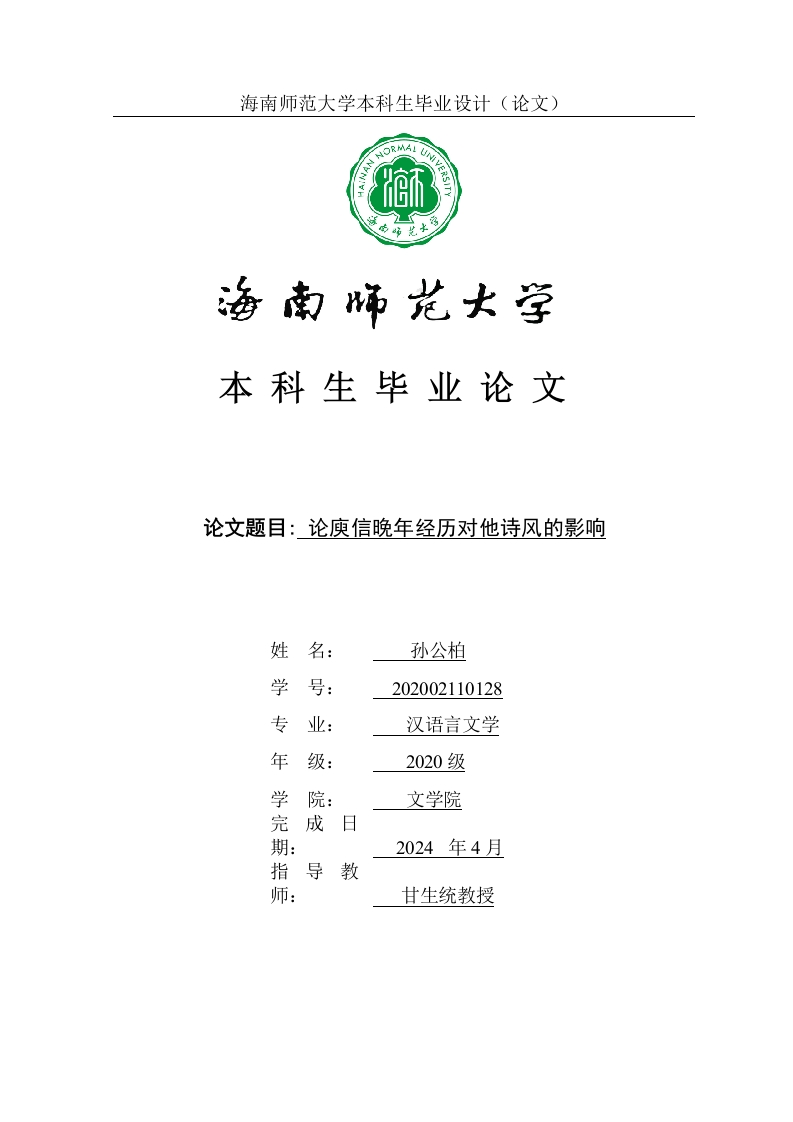 海南师范大学本科生毕业设计(论文)本科生毕业论文论文题目:论庾信晚年经历对他诗风的影响姓名:孙公柏学号:202002110128专业:汉语言文学年级:2020级院:文学院成日期2024年4月导教甘生统教授海南师范大学本科生毕业设计(论文)本科生毕业论文独创性声明本人声明所呈交的毕业论文是本人在导师指导下进行的研究工作及取得的研究成果,除了文中特别加以标注和致谢的地方外,本论文中没有抄袭他人研究成果和伪造数据等行为。与我一同工作的同志对本研究所做的任何贡献均已在论文中作了明确的说明并表示谢意。论文作者签名:孙公柏日期:2024年4月11日本科生毕业论文使用授权声明海南师范大学有权保留并向国家有关部门或机构送交毕业论文的复印件和磁盘,允许毕业论文被查阅和借阅。本人授权海南师范大学可以将本毕业论文的全部或部分内容编入有关数据库进行检索,可以采用影印、缩印或其他复印手段保存、汇编毕业论文。论文作者签名:孙公柏日期:2024年4月11旦指导教师签名:甘生统日期:2024年4月11日海南师范大学本科生毕业设计(论文)目录3(一)本课题的研究背景、目的及意义3(二)国内外研究现状.·++マ一、庾信晚年经历概述.··6(一)庾信晚年政治经历...6(二)庾信晚年心理经历899(二)庾信晚年诗风变迁及其表现1012(一)庾信晚年经历对他思想观念的影响12(二)庾信晚年经历对他人生态度的影响...14(三)庾信晚年经历对他创作技巧的影响.··15四、庾信晚年诗风的文学地位及对杜甫的影响.·1717(二)庾信晚年诗风对杜甫的影响.··17202021参考文献……22232