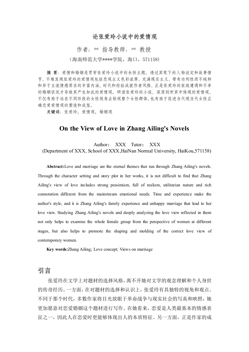 论张爱玲小说中的爱情观作者:*指导教师:*教授(海南师范大学***学院,海口,571158)摘要:爱情和婚烟是贯穿张爱玲小说中的永恒主题。透过其笔下的人物设定和故事情节,不难发现张爱玲的爱情观包括悲观主义色彩浓厚、充满现实主义、带有功利性质不纯粹和异于主流情感需求的丰富内涵。时代和经验成就作者风格,正是张爱玲的家庭遭遇和不幸的婚烟状况才导致其产生如此的爱情观。研读张爱玲的小说,深度剖析其中体现的爱情观,不仅有助于站在不同阶段的女性视角去检视整个女性群体,也有助于促进当代现当代女性正确恋爱爱情观的塑造和成型。关键词:张爱玲;爱情观;婚烟观On the View of Love in Zhang Ailing's NovelsAuthor:XXX Tutor:XXX(Department of XXX,School of XXX,HaiNan Normal University,HaiKou,571158)Abstract:Love and marriage are the etemal themes that run through Zhang Ailing's novelsThrough the character setting and story plot in her works,it is not difficult to find that ZhangAiling's view of love includes strong pessimism,full of realism,utilitarian nature and richconnotation different from the mainstream emotional needs.Time and experience make theauthor's style,and it is Zhang Ailing's family experience and unhappy marriage that lead to herlove view.Studying Zhang Ailing's novels and deeply analyzing the love view reflected in themnot only helps to examine the whole female group from the perspective of women at differentstages,but also helps to promote the shaping and molding of the correct love view ofcontemporary women.Key words:Zhang Ailing;Love concept;Views on marriage引言张爱玲在文学上对题材的选择风格,离不开她对文学的观念理解和个人身世的传奇经历。一方面,在对题材的选择和认识上,张爱玲有其独特的视角和观点。不同于那个时代,多数作家将目光放眼于革命战争与现实社会的写真和映照,她更加愿意对恋爱婚烟这个题材进行写作。在她看来,恋爱是人类最基本的情感表征之一,因此人在恋爱时更能够体现出人的本质特征。另一方面,正是作家的成长环境和个人阅历塑造了其独特的写作风格。居住在局势变幻动荡的上海,她自小就经历过身边众多有关爱情和婚烟的事件,女性特有的情感嗅觉让他对这种情绪的捕捉十分到位,故而能够将这种情绪更好的转化成写作上的动因,让主人公的情绪跃然纸上,与读者产生深刻的共鸣。固然恋爱婚烟这种主题,同家国情怀,历史变迁等这种宏大的主题相比略显单薄,但需要承认的是,即便微小的选题,在经过作者的加工与情感因素的注入后,同样会具有令人出乎意料的效果。与之相延伸的,还可以体现出人类的复杂性,或者人与道德和生命价值等因素之间的互动。对主人公细腻的描写和复杂心理的刻画,在一定程度上对情感和主题的表达并不逊色于更加宏大的主题。对人性的刻画也更不应当局限于传统题材。一、张爱玲小说爱情观的解读(一)悲观主义色彩浓厚,不推崇大团圆式的标准结局与传统的爱情小说往往倾向于男女主幸福美满、破镜重圆、久别重逢等“大团圆”式的结局不同,张爱玲的小说往往会赋予每个女性角色以较为悲惨的结局和命运。虽然悲观主义的结局并不是中国传统文化主流所推崇的组成部分,但是也正如鲁迅先生所言:“所谓悲剧,就是将最美好的东西亲手毁灭给你看。”有时悲剧带来的效果会更加震撼,更加足以引起读者的思考和情感共鸣。在张爱玲的笔下,主人公的命运不完满,往往富有悲剧和讽刺色彩。这是因为张爱玲对世界的认识充满了虚无主义的倾向,她对人生缺乏必要的憧憬,对爱情也缺少坚定的信念。张爱玲觉得人生是虚无的,在社会、历史的运作中,个人是微不足道的,每个人都被不可知的力量玩弄于股掌之中,不能把握自己的命运,只能被动地接受命运的安排。这样悲观消极的态度和她的个人经历是密不可分的,个人亲历和见证了婚姻的失败,才会将对现实中不满和无力的情感诉诸文字和笔下人物中。诸如《色戒》中,沉溺于一时心动的王佳芝,因为霎那的喜欢便亲手葬送了自己和伙伴谋划多日的计划。在提醒易先生“快跑”时,她早已在那一瞬间将民族大义抛之脑后。这种不计后果、盲目顺从一时内心的快感的做法最终导致了全军覆没的悲惨结局。@闫坷:《谈张爱玲小说的婚烟观与爱情观》,《新余学院学报》2016年第2期。(二)充满现实主义,刨去理想关环以经济物质作为爱情和婚姻的基础,多数女主人公的行为动机和理由正是出自此基础上。张爱玲笔下的多数女性角色在爱情关系中都会多方权衡利益,选择最适合自己的、能够切切实实在物质和生活上给予自己帮助的伴侣。婚姻是女人求生的砝码,这样的观念,不是因为女人狭隘或者功利,而实在是女人投入的赌注比较大,不得不这样,她们投入的是一生,张爱玲更加比别人投资多,加上自己的才华,她爱的没有了自己。她不但丢失了自己求生的砝码,还将自己推进了毁灭的深渊。张爱玲之所以有这样的魄力,是因为自己有足够多的勇气。而对大多数女子而言,似乎就不敢这样了。她们对待婚姻的态度,慎重到可以计划到50年后的生活,慎重的原因不过是因为婚姻就好像是女人的第二次出生,嫁的好后半生也就活得好,否则,凄苦的生活将永无止境。⑧例如在《第一炉香》中,女主“由良变娼”的经过,显示出一个孤单脆弱的女子在那样的社会条件下,倘若再没有一个坚强的依附,不能嫁到挑选出的好男人(这里的“好
