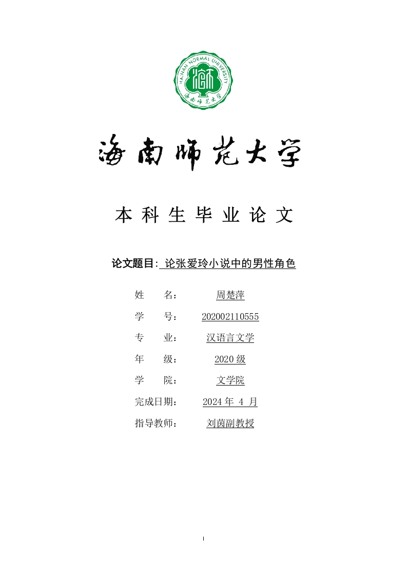 本科生毕业论文论文题目:论张爱玲小说中的男性角色姓名:周楚萍学号:202002110555专业:汉语言文学年级:2020级学文学院完成日期:2024年4月指导教师:刘茵副教授本科生毕业论文独创性声明本人声明所呈交的毕业论文是本人在导师指导下进行的研究工作及取得的研究成果,除了文中特别加以标注和致谢的地方外,本论文中没有抄袭他人研究成果和伪造数据等行为。与我一同工作的同志对本研究所做的任何贡献均已在论文中作了明确的说明并表示谢意。论文作者签名:日期:20年月日本科生毕业论文使用授权声明海南师范大学有权保留并向国家有关部门或机构送交毕业论文的复印件和磁盘,允许毕业论文被查阅和借阅。本人授权海南师范大学可以将本毕业论文的全部或部分内容编入有关数据库进行检索,可以采用影印、缩印或其他复印手段保存、汇编毕业论文。论文作者签名:日期:20年月日指导教师签名:日期:20年月日目录1一、张爱玲小说中男性角色的具体呈现…(二)放荡形骸的都市男性(三)家庭压迫下的惴弱男性.…4二、男性角色特点..5(二)行为习惯…7三、张爱玲颠覆传统的男性形象的原因(一)内在原因101213致谢14