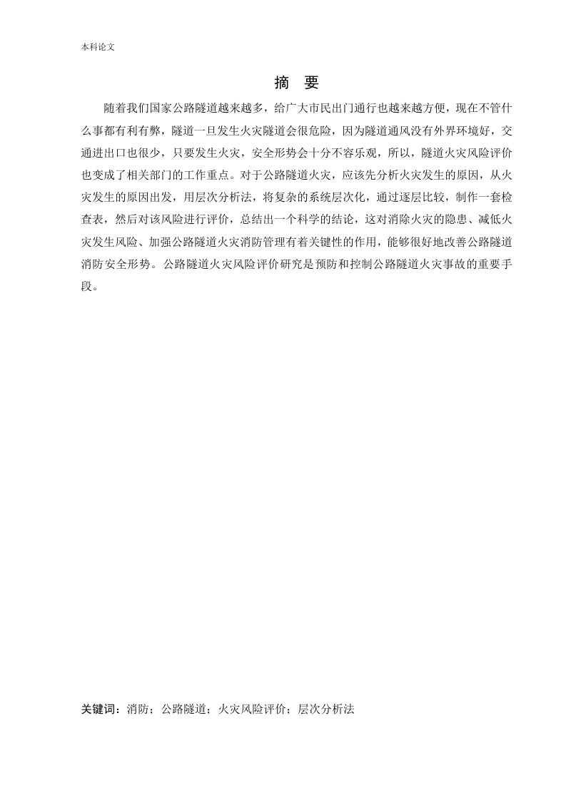 本科论文摘要随着我们国家公路隧道越来越多,给广大市民出门通行也越来越方便,现在不管什么事都有利有弊,隧道一旦发生火灾隧道会很危险,因为隧道通风没有外界环境好,交通进出口也很少,只要发生火灾,安全形势会十分不容乐观,所以,隧道火灾风险评价也变成了相关部门的工作重点。对于公路隧道火灾,应该先分析火灾发生的原因,从火灾发生的原因出发,用层次分析法,将复杂的系统层次化,通过逐层比较,制作一套检查表,然后对该风险进行评价,总结出一个科学的结论,这对消除火灾的隐患、减低火灾发生风险、加强公路隧道火灾消防管理有着关键性的作用,能够很好地改善公路隧道消防安全形势。公路隧道火灾风险评价研究是预防和控制公路隧道火灾事故的重要手段。关键词:消防:公路隧道:火灾风险评价:层次分析法本科论文AbstractThe gradual expansion of the number and scale of highway tunnels in China has brought alot of convenience for the public to travel,but the special structure of the tunnel has broughtdifficulties to the operation and management of the tunnel,especially in case of fire,therestriction of the narrow space of the tunnel will lead to serious danger,and the safetysituation is not optimistic.Therefore,the risk assessment of highway tunnel fire has alsobecome the tunnel safety management Key issues concerned by the Department.Starting fromthe causes of fire risk in highway tunnel,using the analytic hierarchy process and the richworking experience of experts in the industry,a set of checklist for evaluating fire risk inhighway tunnel is designed,and the actual evaluation of fire risk in a highway tunnelmanagement unit is carried out,and the relatively scientific and reasonable comprehensiveevaluation results are summarized.The evaluation results are beneficial to the highway tunnelmanagement unit in rectifying the fire hazards,reducing the fire risk and strengthening itsown fire safety management,which can improve the fire safety situation of the highwaytunnel.Key words:fire protection;highway tunnel;fire risk assessment;AHP本科论文目录第1章绪论.............................1.2本文研究的目的、意义1.3国内外研究现状第2章公路隧道火灾风险评价22.1隧道火灾的原因22.2隧道火灾的特点22.3隧道火灾的破2第3章构建火灾风险评价指标体系33.1指标体系建立原则…3.2指标体系的建立…第4章公路隧道火灾风险评估…4.1层次分析法简介74.2AHP(层次分析法)基本原理4.3基于层析分析法对构建体系进行分析4.3.1构建判断矩阵94.3.2评价指标权重的计算10第5章实例分析285.1实例分析现场简介285.2现场实际调研285.3建立安全检查表5.4评价结果分析第6章结论…参考文献致谢