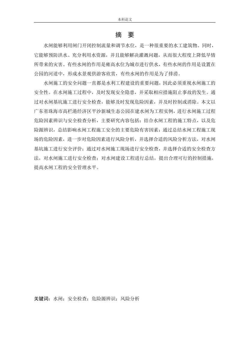 本科论文摘要水闸能够利用闸门开闭控制流量和调节水位,是一种很重要的水工建筑物。同时,它能够预防洪水、充分利用水资源,并且能够解决灌溉问题,从而很大程度上降低旱情所带来的灾害。有些水闸的作用是雍高水位为城市进行供水,有些水闸的作用是设置在公园的河道中,形成水景观供游客欣赏,有些水闸的作用是为了排涝。水闸施工的安全问题一直都是水利工程建设的重要问题,因此必须重视水闸施工的安全性。在水闸施工过程中,及时发现安全隐患,并采取相应措施阻止事故的发生。通过对水闸基坑施工进行安全检查,能够及时发现危险因素,并及时控制或消除。本文以广东省珠海市高栏港经济区平沙新城生态公园在建水闸为工程实例,进行水闸施工过程危险因素辨识与安全检查分析,主要研究内容包括:结合水闸工程的施工特点,以及危险源辨识,总结影响水闸工程施工安全的主要危险有害因素:通过总结水闸工程施工现场的危险因素,进一步对危险因素进行风险分析,并选择合适的风险分析方法,对水闸基坑施工进行安全评价:通过对水闸施工现场进行安全检查,并选择合适的安全检查方法,对水闸施工进行安全检查:对水闸建设工程进行总结,提出合理可行的控制措施,提高水闸工程的安全管理水平。关键词:水闸:安全检查:危险源辨识:风险分析本科论文AbstractThe sluice can control the flow and adjust the water level by opening and closing thegate,which is a very important hydraulic structure.At the same time,it can prevent floods,make full use of water resources,and solve irrigation problems,so as to greatly reduce thedisasters caused by drought.Some sluices are used to provide water for the city at a highwater level.Some sluices are set in the river course of the park to form a water landscape.Some sluices are used to drain water and so on.The safety of sluice construction has always been an important issue in the constructionof water conservancy projects,so we must pay attention to the safety of sluice construction.Inthe process of sluice construction,safety hazards shall be found in time,and correspondingcontrol measures shall be implemented to prevent accidents.Through the safety inspection ofthe sluice foundation pit construction,the risk factors can be found in time and controlled oreliminated in time.Taking the sluice under construction in Pingsha new town ecological parkof gaolangang Economic Zone in Zhuhai City,Guangdong Province as an example,this paperanalyzes the risk factors identification and safety inspection in the construction process of thesluice.The main research contents include:combined with the construction characteristics ofthe sluice project,as well as the hazard source identification,the main risk and harmfulfactors affecting the construction safety of the sluice project;through summarizing theconstruction of the sluice project,the risk factors of the site,further risk analysis of the riskfactors,and the selection of appropriate safety evaluation methods,the safety evaluation ofthe sluice construction;through the safety inspection of the sluice construction site,and theselection of appropriate safety inspection methods,the safety inspection of the sluiceconstruction;the summary of the sluice construction project,put forward reasonable andfeasible control measures to improve the water Safety.Key word:sluice;safety inspection;hazard identification;risk analysis本科论文目录第1章绪论.1.1研究背景与意义......................................1.1.1研究背景1.1.2研究意义…1.2国内外研究现状..21.2.1国外水闸施工过程危险因素辨识与安全检查分析研究现状21.2.2国内水闸施工过程危险因素辨识与安全检查分析研究现状1.3本文的主要研究内容…3第2章水闸工程概况及安全管理分析52.1项目工程概况…2.1.1总体工程概况.…52.1.2气候条件2.1.3水文地质72.1.4施工条件.2.2施工工艺流程.…2.3水闸施工安全管理的内容.…2.4水闸施工安全管理的原则.…82.5水闸施工现场安全事故多发原因分析2.6水闸工程的安全管理9第3章水闸基坑施工现场施工方案分析.103.1.1编制依据103.1.2编制原则…3.1.3编制范围103.2钢板桩支护…103.2.1支护说明3.2.2钢板桩支护工程量汇总11