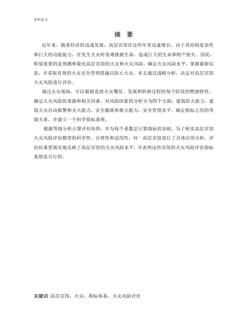 本科论文摘要近年来,随着经济的迅速发展,高层宾馆在这些年里迅速增长。由于其结构复杂性和巨大的功能能力,在发生火灾时很难挽救生命,造成巨大的生命和财产损失。因此,特别重要的是预测和量化高层宾馆的火灾和火灾风险,确定火灾风险水平,掌握最新信息,并采取有效的火灾安全管理措施以防止火灾。本文通过战略分析,决定对高层宾馆火灾风险进行评估。通过火灾现场,可以根据连续火灾爆发、发展和转移过程的每个阶段的燃烧特性,确定火灾风险的来源和相关因素。对风险因素的分析分为四个方面:建筑防火能力、建筑火灾自动报警和灭火能力、安全撤离和救火能力、安全管理水平。确定指标之间的等级关系,并建立一个科学指标系统。根据等级分析计算评估矩阵,并为每个系数层计算指标的加权。为了核实高层宾馆火灾风险评估模型的科学性、合理性和适用性,对一高层宾馆进行了具体应用分析。评估结果更现实地反映了高层宾馆的火灾风险水平,并表明这些宾馆的火灾风险评估指标系统是可行的。关键词:高层宾馆:火灾:指标体系:火灾风险评价本科论文AbstractIn recent years,with the rapid development of the economy,high-rise hotels havegrown rapidly in these years.Because of its structural complexity and huge functional ability,it is difficult to save lives in case of fire,resulting in huge loss of life and property.Therefore,it is particularly important to predict and quantify the fire and fire risk of high-rise hotels,determine the level of fire risk,grasp the latest information,and take effective fire safetymanagement measures to prevent fire.Through strategic analysis,this paper decides toevaluate the fire risk of high-rise hotels.Through the fire scene,the source and related factors of fire risk can be determinedaccording to the combustion characteristics of each stage of continuous fire outbreak,development and transfer process.The analysis of risk factors is divided into four aspects:building fire prevention ability,building fire automatic alarm and fire extinguishing ability,safe evacuation and fire fighting ability,safety management level.Determine the hierarchicalrelationship between indicators and establish a system of scientific indicators.The evaluation matrix is calculated according to the grade analysis,and the weighting ofthe index is calculated for each coefficient layer.In order to verify the scientificity,rationalityand applicability of the fire risk assessment model of high-rise hotels,the concrete applicationanalysis of a high-rise hotel is carried out.The evaluation results more realistically reflect thelevel of fire risk in high-rise hotels and show that the fire risk assessment index system ofthese hotels is feasible.Key words:High rise Hotel;fire;Index system;Fire risk assessment本科论文目录1.1研究背景与意义..1.1.1研究背景11.2对国内外高层宾馆火灾趋势的分析1.3国内外高层宾馆火灾风险评价的现状32.1高层宾馆火灾的现状和特点42.1.1高层宾馆火灾现状..42.1.2高层宾馆火灾的特点....42.2高层宾馆的火灾风险因素分析45第3章高层宾馆火灾风险指标体系的建立3.1高层宾馆火灾特点.3.2建立高层宾馆火灾风险评估指标体系.....83.2.1高层宾馆火灾风险评估指标体系建立的原则893.2.3高层宾馆火灾风险评估因素分析...133.2.4高层宾馆火灾风险评估指标体系17第4章高层宾馆火灾风险评价184.1权重确定的方法...184.1.1层次分析法确定权重.204.2指标权重的确定.21第5章实例分析....265.1实例分析建筑概况...26265.1.2建筑物火灾自动报警与自动灭火能力..27