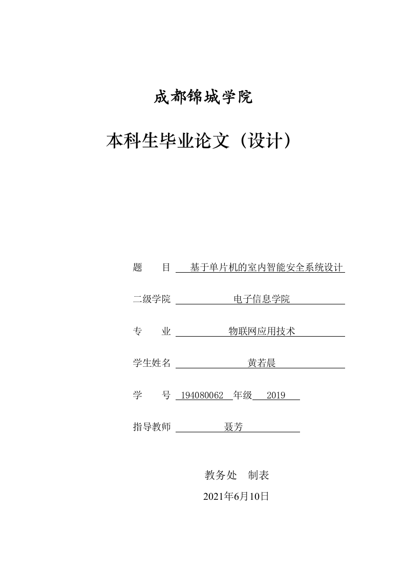 成都锦城学院本科生毕业论文(设计)题目基于单片机的室内智能安全系统设计二级学院电子信息学院专业物联网应用技术学生姓名黄若晨学号194080062年级2019指导教师聂芳教务处制表2021年6月10日基于单片机的室内智能安全设计专业:电子信息学院学生:黄若晨指导老师:聂芳摘要:随着社会的快速发展和人们物质生活水平的不断提高,人们对生活质量的要求越来越高。在室内安全日益受到重视的今天,以室内安全理念为基础的家居产品也逐渐走进我们的生活。本系统是由单片机系统、数据信息采集模块、LCD显示模块、报警电路和GSM通信模块组成,是一个对家庭住宅进行基本环境及安防监测的模型系统。其中包括对监测区域内的人体感应、温度、湿度、可燃气体浓度、火情进行实时监测,当被测区域发生各种突发性事件时,室内蜂鸣器报警,系统通过GSM模块向预先设置的手机发送信息,以便用户及时做出应对措施。用户也可以通过GSM模块查询室内实时信息。本系统在开发软件Kei1C51中进行程序编写,仿真软件Proteus中进行分析调试,通过进行联合仿真实验,实现了室内安全监测系统的基本功能。能够有效保证使用者的人身和财产安全,具有较高的实用价值。关键词:室内安全:单片机:安全监测:报警Indoor Intelligent Safety Design Based on MicroCMMajor:Software ManagementStudent:Chen Weijie Supervisor:Yang AnhuaAbstract:With the rapid development of society and the continuousimprovement of people's material living standards,people's requirements for thequality of life are getting higher and higher.In the indoor safety is increasingly valuedtoday,the home products based on the concept of indoor safety are gradually cominginto our life.This system is composed of microcontroller system,data informationacquisition module,LCD display module,alarm circuit and GSM communicationmodule.It is a model system for the basic environment and security monitoring offamily housing.It includes real-time monitoring of human body sensing,temperature,humidity,combustible gas concentration and fire in the monitoring area.Whenvarious emergencies occur in the tested area,the indoor buzzer will alarm.The systemsends information to the pre-set mobile phone through the GSM module,so that userscan make timely countermeasures.Users can also query the real-time information inthe room through the GSM module.The system is programmed in the developmentsoftware KeilC51,analyzed and debugged in the simulation software Proteus,andrealizes the basic functions of the indoor safety monitoring system.It can effectivelyguarantee the personal and property safety of users,and has a high practical value.Key words:indoor safety;single-chip computer;safety monitoring;alarm