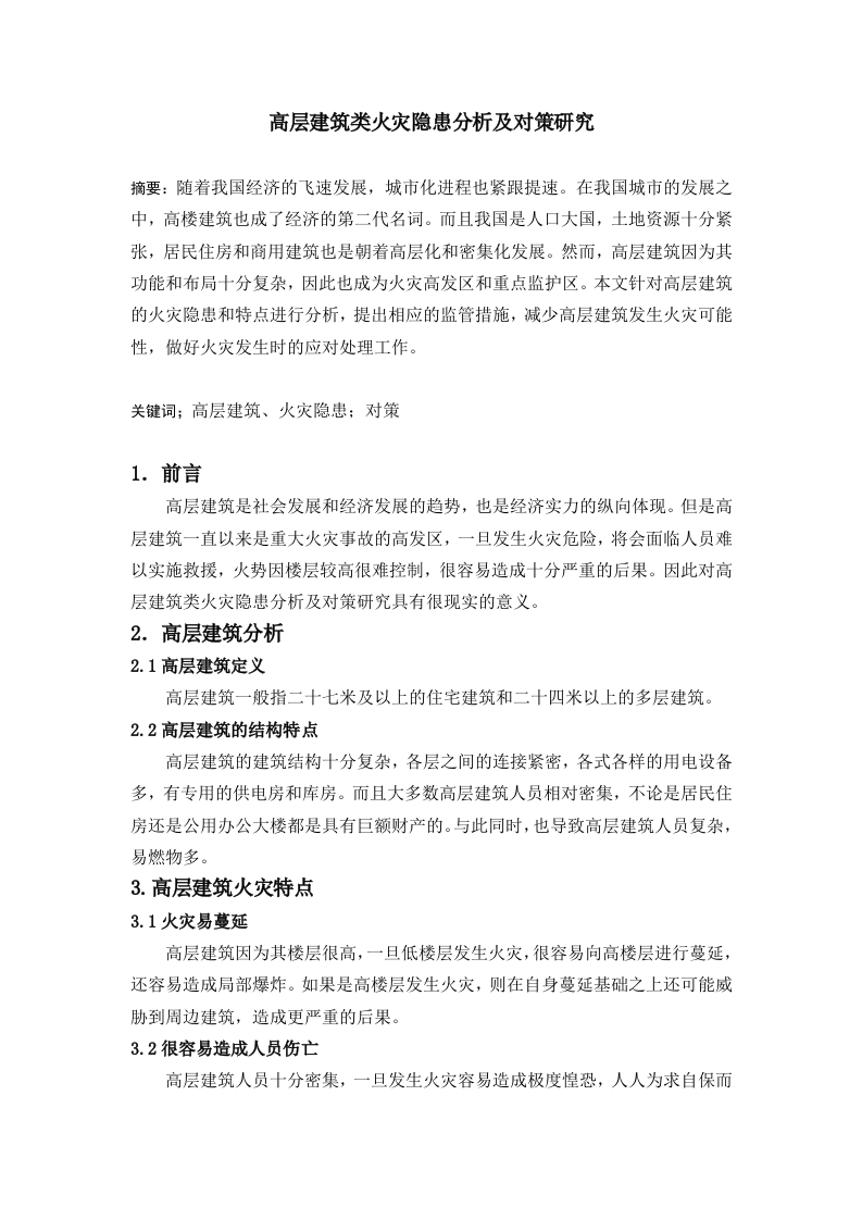 高层建筑类火灾隐患分析及对策研究摘要:随着我国经济的飞速发展,城市化进程也紧跟提速。在我国城市的发展之中,高楼建筑也成了经济的第二代名词。而且我国是人口大国,土地资源十分紧张,居民住房和商用建筑也是朝着高层化和密集化发展。然而,高层建筑因为其功能和布局十分复杂,因此也成为火灾高发区和重点监护区。本文针对高层建筑的火灾隐患和特点进行分析,提出相应的监管措施,减少高层建筑发生火灾可能性,做好火灾发生时的应对处理工作。关键词;高层建筑、火灾隐患:对策1.前言高层建筑是社会发展和经济发展的趋势,也是经济实力的纵向体现。但是高层建筑一直以来是重大火灾事故的高发区,一旦发生火灾危险,将会面临人员难以实施救援,火势因楼层较高很难控制,很容易造成十分严重的后果。因此对高层建筑类火灾隐患分析及对策研究具有很现实的意义。2.高层建筑分析2.1高层建筑定义高层建筑一般指二十七米及以上的住宅建筑和二十四米以上的多层建筑。2.2高层建筑的结构特点高层建筑的建筑结构十分复杂,各层之间的连接紧密,各式各样的用电设备多,有专用的供电房和库房。而且大多数高层建筑人员相对密集,不论是居民住房还是公用办公大楼都是具有巨额财产的。与此同时,也导致高层建筑人员复杂,易燃物多。3.高层建筑火灾特点3.1火灾易蔓延高层建筑因为其楼层很高,一旦低楼层发生火灾,很容易向高楼层进行蔓延,还容易造成局部爆炸。如果是高楼层发生火灾,则在自身蔓延基础之上还可能威胁到周边建筑,造成更严重的后果。3.2很容易造成人员伤亡高层建筑人员十分密集,一旦发生火灾容易造成极度惶恐,人人为求自保而进行拥挤,反而适得其反,造成更大的人员伤亡。而且,高层建筑有专用的供电和物品管理空间,一旦这些地方受到了危及,极容易造成场面失控,人员生命安全受到严重威胁。4.高层建筑火灾隐患分析4.1高层建筑设计施工不规范目前我国仍然存在很大一部分高层建筑没有按照国家要求的安全防护措施进行设计施工,还有一些高层建筑即使设计时加入了国家的建筑防火安全规范和准则,但是在实际施工的时候为了材料和经费的节约,擅自更改设计,减少了消防安全设施,似的这个高层建筑一开始就有了隐含的隐患。而且有可能受设计影响,导致高层建筑通风性能极差,当发生火灾时,浓烟浓度过高,严重影响了救援时间,使得人员被困于浓烟中造成室息死亡。4.2装修材料增大火灾负荷对于高层建筑的装修,很多设计商为了建筑的保温功效,在外墙设计上采用了易燃可燃的危险材料,已经在很多高层建筑上发生过火灾了。对于室内装修,更是采用了十分多的易燃化学材料,完全没有考虑环保和易燃材料的威肋性。而且这些材料不仅很容易燃烧,还在燃烧之后会产生二氧化硫、二氧化碳、一氧化碳、二氧化氮等有毒气体,被人体吸入将造成很大的危害。4.3楼内物品具有火灾危险性很多高层建筑用作商业用途,比如从事服装、皮鞋、箱包等行业,如果一旦发生火灾,这些楼内物品将会产生促进火势急速蔓延的反作用,而且还会产生浓烟和有毒气体,造成楼内温度迅速升高,这对于人员逃亡和救助是极其不利的。而且有资料不完全统计,七八成以上因火灾死亡的人员都是烟气导致的,烟气含有各种有毒气体,极其容易造成晕厥。对于部分从事电器和用电商品的行业,还可能造成局部爆炸等危险事件发生。4.4防火装置维修保养不到位高层建筑建成之后,管理部门很容易松懈对防火装置的维修保养管理,大家都以不会发生火灾为主观臆断。因此,由于经费或者是管理人员的懈怠,使得建楼时候所安装的防火装置并未得到良好的检查维修和保养,几乎是形同虚设。而且很多消防装置如果保养不到位,很容易造成损坏,进而影响整栋楼的防火系统。如果一旦发生火情,那么这些装置给人们造成的错觉反而会造成负面影响,后果会更加严重。4.5职责制度和员工工作没落实高层建筑因为楼层多,和内部功能的复杂,使得各个单位只管自己事情,对于防火之类的公共事情责任心很低。而且很多高层建筑不建立完整的消防管理体系,使得产品维护和例检十分混乱,当发生危险时则会更加混乱互相推诿。而且很多员工的消防知识管理素质偏低,对于基础设施使用控制都没合格,还存在一些员工的责任心和意识十分淡薄,即使身在值班室的岗位之上,也是进行与岗位无关的事情,曾经就发生过值班室工作人员将火灾报警进行消音后继续玩游戏的情况,最终造成十分严重的后果。4.6灭火救援力量不足对于城市消防单位的统计数据存在消防器具射程不够,云梯举高消防车高度不够,承载人员数量偏少,而且在城市执勤方面存在人员车辆和建筑高楼不匹配的情况,增大了现有消防队的任务量。一旦人员分配出现问题时将会造成不可估量的后果。4.7群众自救逃生能力差对于我国近些年发生过不少火灾,很多都有不少人员伤亡,其伤亡原因大致可以总结如下:第一,群众对于建筑的结构不了解,对安全出口位置,逃生通道均不知道:第二,当出现火灾险情时候,情绪过于紧张导致心态出现问题,做出莽撞行为:第三,对于自身防护意识差,不了解准备工作,还会做出跳楼逃生等不理智行为。总结以上原因,我们可以看出,很多人员伤亡都是因为安全意识不强,对于火灾的基本防