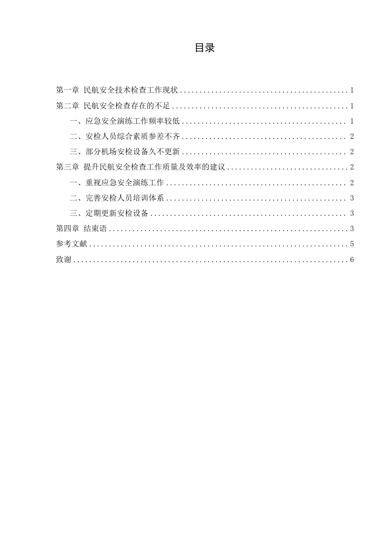 目录第一章民航安全技术检查工作现状..第二章民航安全检查存在的不足..·一、应急安全演练工作频率较低.....1二、安检人员综合素质参差不齐…三、部分机场安检设备久不更新…2二、完善安检人员培训体系.…33参考文献…民航岗位服务与安全检查摘要:民航安全技术检查是民航确保飞机和旅客生命财产安全的必要措施,是民航空防安全保卫工作的重要组成部分。民航安全技术检查具有责任性强、政策性强、时间性强、专业性强以及风险性大等特点。本文以应急安全演练工作频率较低、安检人员综合素质参差不齐、部分机场安检设备久不更新为切入点,梳理了当下民航安全检查工作中存在的不足,有针对性的为提升民航安全检查工作质量及效率提出建议,对民航安全检查工作有一定的现实意义。关键词:民航:安全技术检查:提升质量与效率四川西南航空职业学院毕业论文第一章民航安全技术检查工作现状民航安全技术检查,是民航空防安全保卫工作的重要组成部分,是国务院民用航空主管部门授权的专业安检队伍。为保障航空安全,依照国家法律法规对乘坐民航班机的中、外籍旅客及物品以及航班货物、邮件进行公开的安全技术检查,防范劫持、爆炸民航班机和其他危害航空安全的行为,保障国家和旅客生命财产安全,具有强制性和专业技术性。同时,民航安全技术检查是确保飞机和旅客生命财产安全的必要措施,是一项非常重要的工作。民航安全技术检查工作要求在较短时间内完成对所有乘客及其行李物品的安全检查,同时要确保安全,否则一旦出现失误,后果严重,损失巨大,在国际国内造成极坏的政治影响。因此,民航安全技术检查工作具有责任性强、政策性强、时间性强,专业性强以及风险性大等特点。目前,各大民航运输机场均设有自己的安检部门,安检部门的工作人员实行轮岗制,在机场运营期间都会保证有安检人员在岗。民航运输机场安检人员的主要工作职责是在航站楼出入口对进站旅客及其所携带的行李进行安全检查,还要负责飞行区安全检查、登机口安全检查等等。当下,民用航空运输市场中依旧存在很多不安全因素,这些不安全因素使得民航安检工作的效率及质量有待提升。因此本文将结合民航安检工作的实际,分析其中存在的问题,针对性地提出改进建议。第二章民航安全检查存在的不足一、应急安全演练工作频率较低在真实的航空运输不安全事件中,留给工作人员应对的时间是很短的,不法分子往往只需要短短的几秒钟就可以实施危险犯罪行为,因此要想及时有效地将犯罪行为制止对于工作人员的反应速度及临场应变能力的要求是比较高的。安检人员作为民用航空运输安全保卫工作中的重要组成部分势必要具备较强的应急处突能力,而反应速度及临场应变能力的提升需要依靠应急安全演练来逐步提升。然而,民用航空运输机场由于生产任务繁重,使得安全检查岗位的工作人员工作强度较大,因此在应急演练工作上投入的时间和精力比较少,使得应急演练的频率比较低。这种情况下就意味着安全检查岗位的工作人员缺乏紧急情况处置的练习机会,进而就会影响到民航安检人员的应急处突能力。除此之外,当下不法分子的犯罪形式多种多样,早期的民航运输领域安全监管工作体系不够完善,使得不法分子可以携带某些具有危险性的物品搭乘飞机,而随着民航安全监