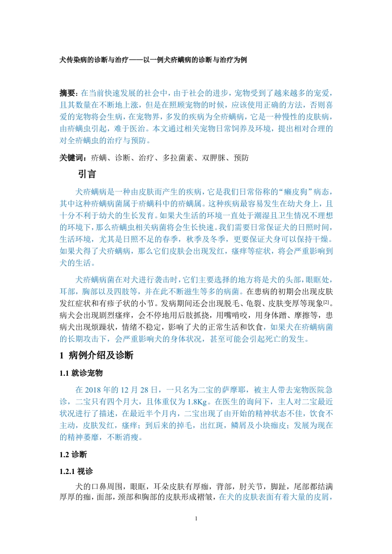 犬传染病的诊断与治疗一一以一例犬疥螨病的诊断与治疗为例摘要:在当前快速发展的社会中,由于社会的进步,宠物受到了越来越多的宠爱,且其数量在不断地上涨,但是在照顾宠物的时候,应该使用正确的方法,否则喜爱的宠物将会生病,在宠物界,多发的疾病为全疥螨病,它是一种慢性的皮肤病,由疥螨虫引起,难于医治。本文通过相关宠物日常饲养及环境,提出相对合理的对全疥螨虫的治疗与预防。关键词:疥螨、诊断、治疗、多拉菌素、双胛脒、预防引言犬疥螨病是一种由皮肤而产生的疾病,它是我们日常俗称的“癞皮狗”病态,其中这种疥螨病菌属于疥螨科中的疥螨属。这种疾病最容易发生在幼犬身上,且十分不利于幼犬的生长发育。如果犬生活的环境一直处于潮湿且卫生情况不理想的环境下,那么疥螨虫相关病菌将会生长快速。我们需要日常保证犬的日照时间,生活环境,尤其是日照不足的春季,秋季及冬季,更要保证犬身可以保持干燥。如果犬得了犬疥螨病,那么它们皮肤会出现发红,瘙痒等症状,将会严重影响到犬的生活。犬疥螨病菌在对犬进行袭击时,它们主要选择的地方将是犬的头部,眼眶处,耳部,胸部以及四肢等,并在此不断滋生等多的病菌。在患病的初期会出现皮肤发红症状和有疹子状的小节。发病期间还会出现脱毛、龟裂、皮肤变厚等现象四。病犬会出现剧烈瘙痒,会不停地用后肢抓挠,用嘴啃咬,用身体蹭、摩擦等,患病犬出现烦躁状,情绪不稳定,影响了犬的正常生活和饮食,如果犬在疥螨病菌的长期攻击下,会严重影响犬的身体状况,甚至可能会引起死亡的发生。1病例介绍及诊断1.1就诊宠物在2018年的12月28日,一只名为二宝的萨摩耶,被主人带去宠物医院急诊,二宝只有四个月大,且体重仅为1.8Kg。在医生的询问下,主人对二宝最近状况进行了描述,在最近半个月内,二宝出现了由开始的精神状态不佳,饮食不主动,皮肤发红,瘙痒:到后来的掉毛,出红斑,鳞屑及小块痂皮:发展为现在的精神萎靡,不断消瘦。1.2诊断1.2.1视诊犬的口鼻周围,眼眶,耳朵皮肤有厚痂,背部,肘关节,脚趾,尾部都结满厚厚的痂,面部,颈部和胸部的皮肤形成褶皱,在犬的皮肤表面有着大量的皮屑,且部分皮肤由于摩擦而呈现为象皮样,是所谓的象皮病。由于皮肤剧痒难耐,它会经常性抓挠。图1结厚痴的耳朵图2全身感染疥螨的身体1.2.2检查方法12.2.1热检查法我们可在存有病态的皮肤表面刮下干燥的皮屑,并且在没有显微镜的情况下,可将皮屑放于平皿或是黑色纸上,然后将其在太阳下暴晒或者对其进行加热,我们可以观察到在加热后有白色虫体在移动,其白色虫体可以暂定为螨虫病症。取适量从皮肤刮下的皮屑放置于载玻片上,滴加甘油或者10%的氢氧化钠溶液,盖上盖玻片后置于显微镜下观察。1.2.23实验室诊断法用经过消毒的手术刀片在对犬的皮肤表面进行刮取,直至皮肤表面有少量血液渗出,选择的位置为患病皮肤和健康皮肤的交界处,刮取到的东西放于载玻片上。滴加2~3滴香柏油均匀混合,加盖玻片微火加热2~5s后再用在160倍显1.2.3诊断结果通过在显微镜下的观察,可以发现疥螨病菌活体的移动,因此可以确定二宝所得疾病为皮肤疥螨病。疥螨病菌的外形多为椭圆或圆形,且腹面呈扁平状,背面呈隆起状,颜色为淡黄白色。但是雌雄之间存在差别。雌螨体长0.30-0.40mm,雄螨体长约0.19-0.23mm。雄螨除了第三对足上,雌螨除了第三第四对足上没有吸盘,但在这些足上末端分别长有一根刚毛,在其他足上都有一个吸盘,吸盘的位置在一根不分节的中等长短的盘柄的末端。患病犬会出现精神萎靡,食欲不振的情况,且会因为皮肤表面瘙痒而不断抓咬,局部出现脱毛、斑疹、小脓疱,继而出现痂皮、瘢痕、糜烂和皮肤结节的。2图3显微镜下的疥螨2治疗方法2.1治疗原则2.1.1找出病源,彻底杀虫我们应及时对犬进行诊断,在诊断中通过肉眼的直接观察,实验室的确切诊断,显微镜的帮助,来检查出病原体的具体情况,然后再对症下药,我们必须从根源上解决实质性的问题,这样才可以彻底杀虫,彻底治疗,不再复发,如果在没有找到病原体之前,就盲目的使用一些药物进行治疗,这对犬来说是不负责任的体现,这些药物可能会抑制病原体,但是也可能会对病原体进行滋养,促进病原体快速生长,耽误了最佳的治疗效果。2.1.2修复皮肤保护层在使用药物治疗的过程中,需要考虑到药物的成分是否会对皮肤造成一定的刺激或伤害,在这种情况下,我们就可以选择多种药物同时使用,这样在配合药中,会包含可以治疗皮肤的,可以减缓药物刺激的,可以对皮肤修复的。如果皮肤表面有脓包性皮炎或是湿疹性皮炎所引起的皮肤表面疼痛,肿胀,又或是想要促进伤口的愈合,预防病菌的感染,可以选择伤复康乳膏:科盾蜂蜜精华油软膏可以有效地保护皮肤,软化皮肤组织,由蜂蜜和精华油提炼而成,有效酵素高,PH值低。在湿润的环境之中,蜂蜜酵素能产生小量过氧化氢。过氧化氢有净化、杀菌的作用。软膏的低PH值能提供一个理想的愈合环境。天然精华油能促进修复损坏的皮肤及增强消毒功能2.1.3补充营养和能量由于患病期间的动物精神状态不好,同时影响到他们的正常进食,为了防止在患病期间动物出现身体营养不良,代谢机能下降,抵抗力与免疫力严重不足的情况发生,需要对患病动物及时补充营养和微量元素,以保证他们的正常身体机能及体质