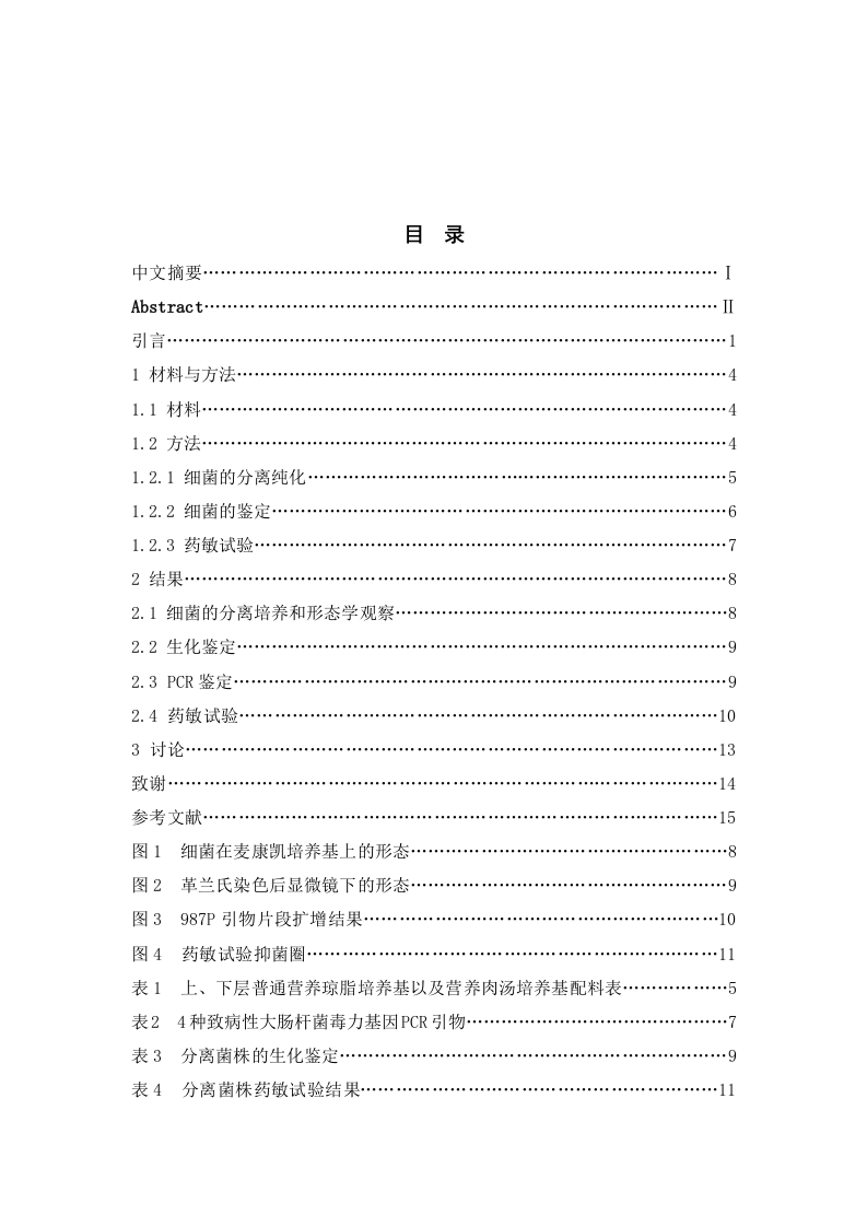目录中文摘要…Abstract…引言…】材料与方法…41.2.1细菌的分离纯化…1.2.2细菌的鉴定…1.2.3药敏试验……72结果…82.1细菌的分离培养和形态学观察…82.2生化鉴定……92.3PCR鉴定2.4药敏试验…3讨论……13参考文献……15图1细菌在麦康凯培养基上的形态…8图2革兰氏染色后显微镜下的形态…9图3987P引物片段扩增结果…图4药敏试验抑菌圈…11表1上、下层普通营养琼脂培养基以及营养肉汤培养基配料表…5表24种致病性大肠杆菌毒力基因PCR引物…7表3分离菌株的生化鉴定…9表4分离菌株药敏试验结果…11引起仔猪腹泻的致病性大肠杆菌分离及鉴定摘要:烟台海阳地区某猪场新生仔猪发生了大规模的腹泻,为了判断其发病原因及病原体种类,从该养猪场采集腹泻仔猪粪便及肛门拭子48份,对粪样进行了细菌的分离纯化、革兰氏染色镜检,生化试验,P℃℉鉴定,血清型鉴定以及药物敏感性检测。结果表明,致病性大肠杆菌感染导致了该猪场发生仔猪腹泻疫情。分离到的菌株血清型为987P型,该菌株对头孢噻肟、恩诺沙星、环丙沙星、左氧氟沙星敏感。通过检测为该猪场仔猪腹泻的治疗与防控提供了依据。关键词:仔猪腹泻:大肠杆菌:分离:鉴定