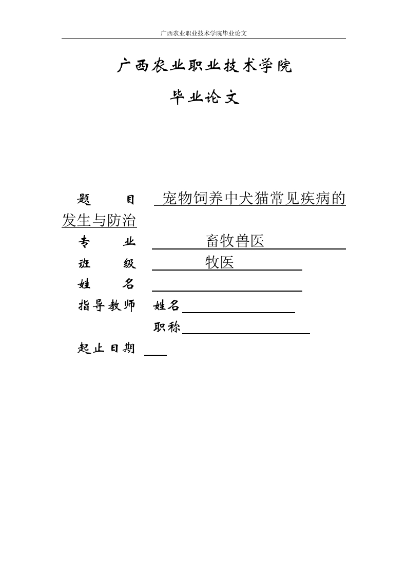 广西农业职业技术学院毕业论文广西农业职业技术学院毕业论文宠物饲养中犬猫常见疾病的发生与防治专业畜牧兽医班级牧医姓名指导教师姓名职称本人声明我声明,本论文及其设计工作是由本人在指导教师的指导下独立完成的,在完成论文时所利用的一切资料均已在参考文献中列出。作者:年月日摘要近年来,随着人们物质生活水平的极大提升,越来越多的人需要宠物的陪伴,而在宠物当中,宠物犬或宠物猫是养殖比例相对较大,在宠物犬猫的饲养期间,尽管它给人类带来了很多快乐,同时也带来一些传染疾病。尤其是在夏季来临之时,因为天气较为炎热,再加上主人的大意,宠物犬、宠物猫比较容易患上疾病。本文主要围绕宠物饲养中犬猫常见疾病的预防和治疗进行简要的分析。关键词:宠物:饲养犬猫疾病:治疗预防2