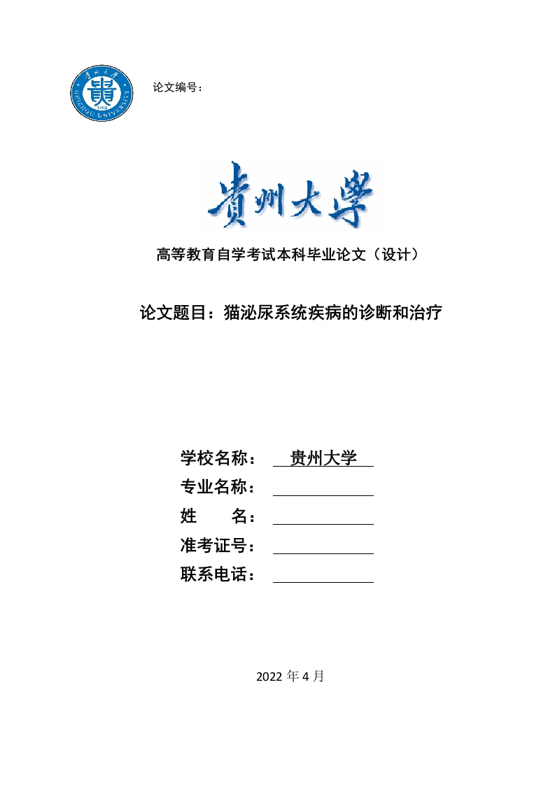 论文编号:高等教育自学考试本科毕业论文(设计)论文题目:猫泌尿系统疾病的诊断和治疗学校名称:贵州大学专业名称:姓名:准考证号:联系电话:2022年4月贵州大学自学考试本科毕业论文(设计)诚信责任书本人郑重声明:本人所呈交的毕业论文(设计),是独立进行研究所完成。毕业论文(设计)中凡引用他人已经发表或未发表的成果、数据、观点等,均已明确注明出处。特此声明。论文(设计)作者签名:日期:目录Abstract.Key words...........引言…1.1食物.…1.2饮水量不足、水源质量差21.3应激反应.21.5过度肥胖,缺乏运动...21.6尿道栓子(UP)31.7猫自发性膀胱炎(FIC)342流行特点75.1临床检查..95.2膀胱B超检查..9105.3.1血样采集方法105.3.2血常规检查结果11115.5血气检查....11136.1术前准备136.2术中过程.13