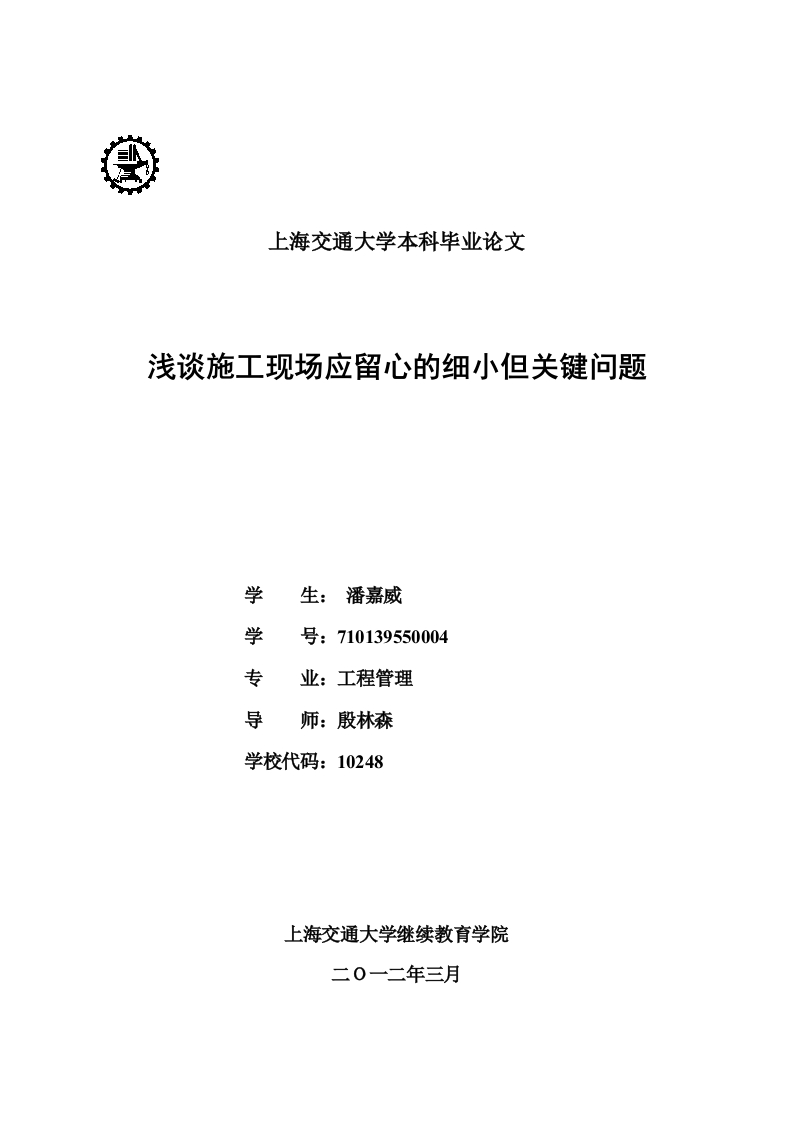 上海交通大学本科毕业论文浅谈施工现场应留心的细小但关键问题学生:潘嘉威学号:710139550004专业:工程管理导师:殷林森学校代码:10248上海交通大学继续教育学院二0一二年三月上海交通大学本科毕业论文浅谈施工现场应留心但细小关键的问趣毕业论文声明本人郑重声明:1、此毕业论文是本人在指导教师指导下独立进行研究取得的成果。除了特别加以标注和致谢的地方外,本文不包含其他人或其它机构已经发表或撰写过的研究成果。对本文研究做出重要贡献的个人与集体均已在文中作了明确标明。本人完全意识到本声明的法律结果由本人承担。2、本人完全了解学校、学院有关保留、使用学位论文的规定,同意学校与学院保留并向国家有关部门或机构送交此论文的复印件和电子版,允许此文被查阅和借阅。本人授权上海交通大学网络教育学院可以将此文的全部或部分内容编入有关数据库进行检索,可以采用影印、缩印或扫描等复制手段保存和汇编本文。3、若在上海交通大学网络教育学院毕业论文审查小组复审中,发现本文有抄袭,一切后果均由本人承担(包括接受毕业论文成绩不及格、缴纳毕业论文重新学习费、不能按时获得毕业证书等),与毕业论文指导老师无关。作者签名:日期:上海交通大学本科毕业论文浅谈施工现场应留心但细小关键的问题浅谈施工现场应留心的细小但关键问题摘要近年来,施工现场管理受到了建筑行业内部的极高重视。施工企业在项目实施过程中既要追求企业利润又要确保满足质量、安全、进度的要求,只有提高施工现场的管理,才能达到目标的实现。也就是说,施工企业若想在竞争日趋激烈的建筑市场之中处于不败之地,就必须将建筑施工的现场管理工作放在首位。本文阐述了建筑施工现场管理现状,分析了其重要性,并结合工程案例浅谈施工现场应留心的关键问题,探讨了建筑施工现场管理可行性措施。关键词:施工现场、管理、管理措施探讨Discussion on the Management atConstruction Site