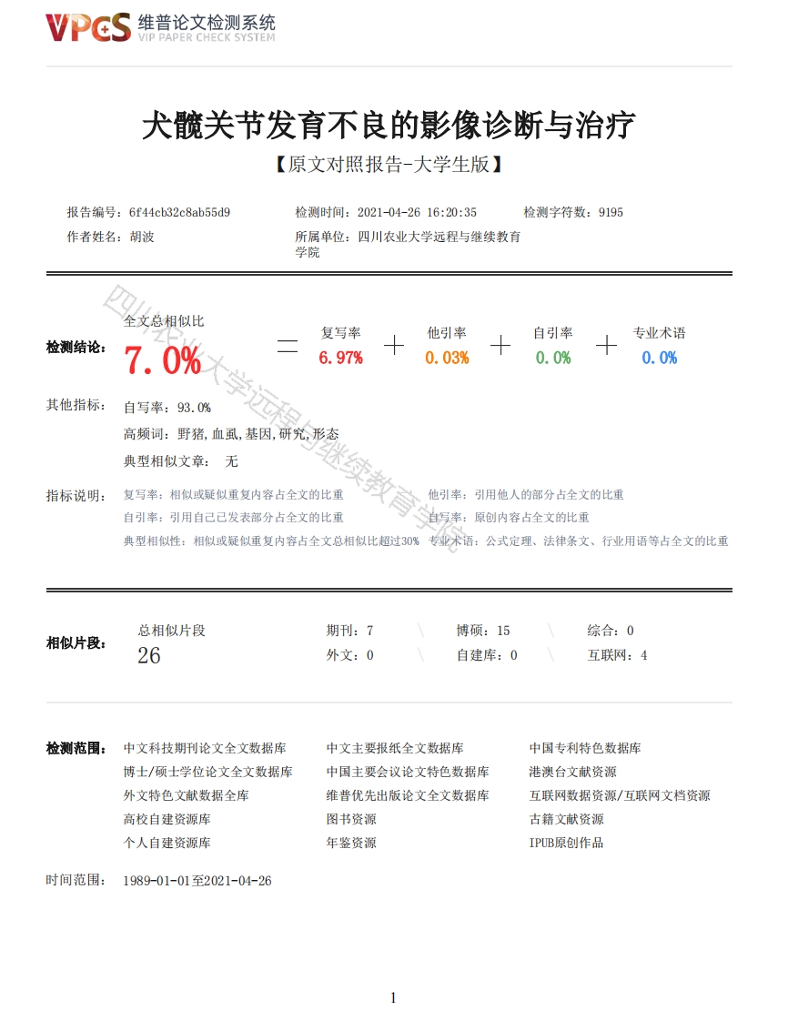 维普论文检测系统VIP PAPER CHECK SYSTEM犬髋关节发育不良的影像诊断与治疗【原文对照报告-大学生版】报告编号:6f44cb32c8ab55d9检测时间:2021-04-2616:20:35检测字符数:9195作者姓名:胡波所属单位:四川农业大学远程与继续教育学院全文总相似比复写率他引率自引率专业术语检测结论:7.0%6.97%0.03%0.0%0.0%其他指标:自写率:93.0%高频词:野猪,血虱,基因,研究,形态典型相似文章:无指标说明:复写率:相似或疑似重复内容占全文的比重他引率:引用他人的部分占全文的比重自引率:引用自己已发表部分占全文的比重自写率:原创内容占全文的此重典型相似性:相似或疑似重复内容占全文总相似比超过30%专业术语:公式定理、法律条文、行业用语等占全文的比重总相似片段期刊:7博硕:15综合:0相似片段:26外文:0自建库:0互联网:4检测范围:中文科技期刊论文全文数据库中文主要报纸全文数据库中国专利特色数据库博士/硕士学位论文全文数据库中国主要会议论文特色数据库港澳台文献资源外文特色文献数据全库维普优先出版论文全文数据库互联网数据资源/互联网文档资源高校自建资源库图书资源古籍文献资源个人自建资源库年鉴资源IPUB原创作品时间范围:1989-01-01至2021-04-26维普论文检测系统VIP PAPER CHECK SYSTEM原文对照颜色标注说明:■自写片段■复写片段(相似或疑似重复)口引用片段(引用)■专业术语(公式定理、法律条文、行业用语等)四川农业大学网络教育毕业论文专业动物医学学号W410219120121姓名胡波成绩初审意见初审老师签名:评审院意见评审老师签名:备注一种野猪血虱的形态学观察及分子特征分析专业:动物医学学号:W410219120121学生姓名:胡波(指导老师:朱德康)摘要:野猪血虱隶属于虱目、吸虱亚目、血虱科、血虱属,是经济动物家猪重要的外寄生虫之一。目前对于野猪血虱形态学的研究欠缺。本文利用野猪血虱的cox1基因,应用DNA条形码技术,对野猪血虱进行鉴定。以及对野猪血虱成虫进行了形态学观察,为准确、快速鉴定野猪血虱成虫、进一步研究野猪血虱提供了理论依据,也进一步证实DNA条形码技术再生物鉴定中具有十分重要的作用。关键词:野猪血虱:形态;DNA条形码1.绪论1.1野猪血虱的分类地位及研究现状1.1.1野猪血虱的分类地位野猪血虱隶属于虱目、吸虱亚目、血虱科、血虱属。血虱科吸虱主要寄生于有蹄类动物体表,以偶蹄兽居多。与颚虱科均为重要的家畜体表寄生虫。血虱科仅包含一个属,即血虱属,其中野猪血虱隶属于此属。1.2野猪血虱的生物学习性1.2.1野猪血虱的食性野猪血虱顾名思义,主要靠吸食宿主动物的血液为营生。野猪血虱的虫卵自发育成若虫,就通过将刺吸式口器2维普论文检测系统VIP PAPER CHECK SYSTEM刺入宿主动物的皮肤,吸食宿主的血液和组织液。野猪血虱会在宿主身上进行正常运动,到达宿主全身,待达到了适合吸食血液的地方,野猪血虱将头部和胸部的六条腿固定在该处,同时将口器刺向宿主皮肤内。野猪血虱成虫一天可吸食猪体血液2-3次,每次可持续5-30mi,可吸食血液量约0.2-0.3加L,具体吸血量取决于吸血时间,而吸血时间取决于环境温度。同时,野猪血虱在吸血的同时,将唾液腺分泌物释放到宿主皮肤中,引起瘙痒、皮肤炎症等。1.2.2野猪血虱的生活史野猪血虱的发育分为卵、若虫和成虫三个时期,是一种不完全变态发育方式。野猪血虱是一种永久性寄生虫,它一生的发育过程都与宿主猪紧密联系。即使在交配产卵后,虫卵也在猪体上发育成为若虫,通过直接接触感染其他猪支。在野猪血虱进行交配时,雄虱爬到雌虱下方,交配时间约10-15min,交配后,雄虱死亡,雌虱经3-4d产下虫卵,每只雌虱每次约能产下50-90颗卵,在产卵后即死亡。虫卵黏附于猪毛上,在条件适宜情况下,约13-15d,虫卵孵化成为若虫,在猪体上继续生长发育。若虫经过3次蜕皮,经2-3周,在第3次蜕皮以及几丁质胸骨版出现后,标志着若虫成长为成虱,成虱则继续在猪体上进行繁殖。虱子离开猪体后约3-7即死亡。野猪血虱对于雄性野猪的感染率较雌性野猪高,几近两倍,并且研究显示,野猪血虱全年可发现,无明显季节感染之分,但其中秋、冬季节感染率相对较高,且多为若虫感染,春季野猪血虱的感染率相对较低,在夏季炎热时候,感染率达到最低值,此时若虫的感染率也达到最低。Kadulski(1974)[1]及Kutzer[2]和Garedaghi Yagoob(1971)[3]发现年轻动物身上的虱子感染率会相对更高,并且多为同群感染。1.2.3野猪血虱的特殊生理野猪血虱对温度敏感,在高于它的正常生活的温度或低于正常温度时,野猪血虱的寿命、产卵量、运动和代谢等都受到影响:野猪血虱有灵敏的嗅觉,对其他气味与猪体自身气味产生反应,特别是对影响自身生活的物质的气味产生强烈反应:野猪血虱还有强烈的光感,在黑暗中行动更加敏捷。本文对野猪血虱成虫进行了形态学研究,为准确、快速鉴定野猪血虱成虫、进一步研究野猪血虱提供了理论依据,也进一步证实DNA条形码技术再生物鉴定中具有十分重要的作用。2.实验材料与方法2.1标本采集形态结构观察材料,自2019年12月起,共采集到野猪血虱成虫10只,分别来自湖南农业大学兽医院。分子研究材料于2019年11月30日采集自湖南省长沙市湖南农业犬学兽医院,家猪体表。在DNA条形码的编号标记中,野猪血虱分别编号为Adult1-10。2.2试剂和仪器设备试剂:乙醇、乙酸、氢氧化钾、选购自Promega公