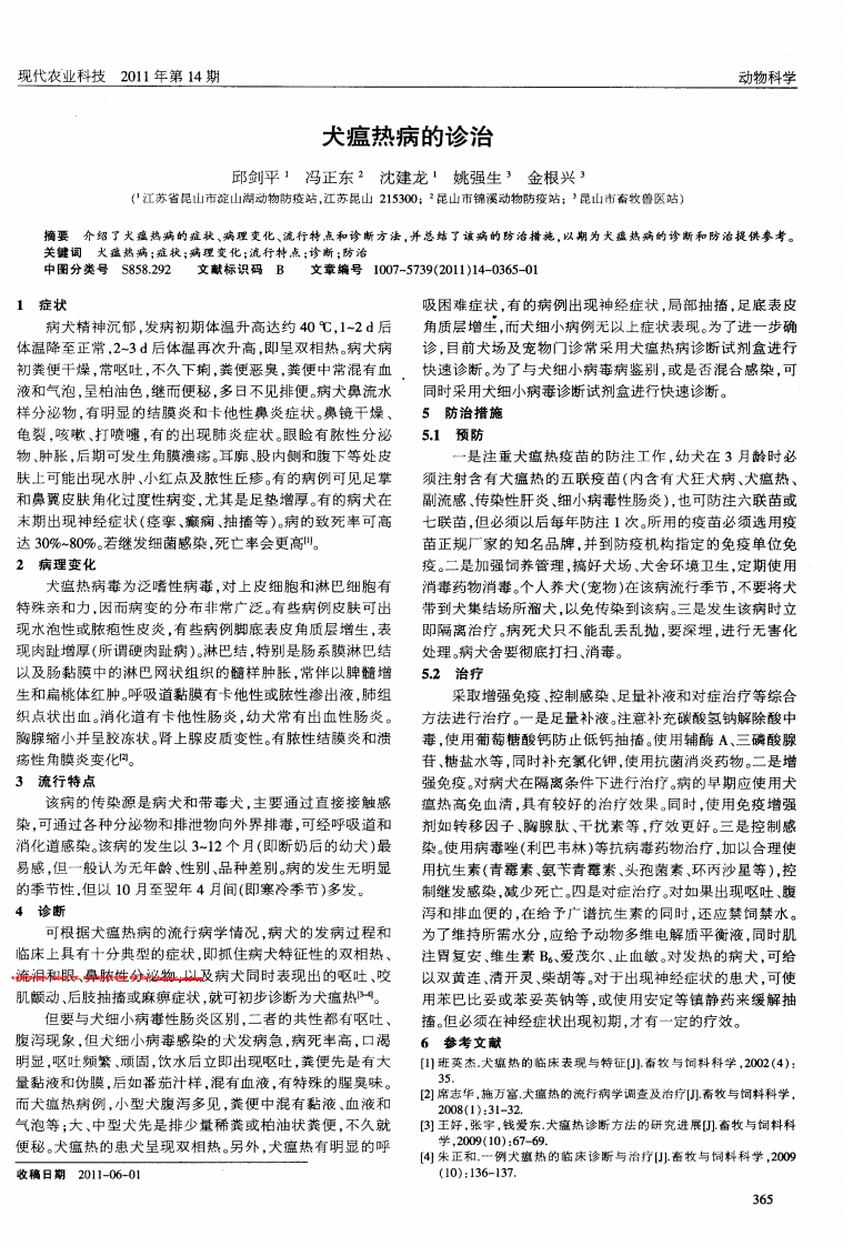 现代农业科技2011年第14期动物科学犬瘟热病的诊治邱剑平1冯正东2沈建龙!姚强生3金根兴3(江苏省昆山市淀山湖动物防疫站,江苏昆山215300:2昆山市锦溪动物防疫站:3昆山市畜牧尊医站)摘要介绍了犬瘟热病的症状、病理变化、流行特点和珍断方法,并总结了该病的防治措燕,以期为犬遮热病的珍断和防治提供参考。关键词犬瘟热病:症状:病理变化:流行特点:珍断:防治中图分类号S858.292文献标识码B文章编号1007-5739(2011)14-0365-011症状吸困难症状,有的病例出现神经症状,局部抽搐,足底表皮病犬精神沉郁,发病初期体温升高达约40℃,1-2d后角质层增生,而犬细小病例无以上症状表现。为了进一步确体温降至正常,2-3d后体温再次升高,即呈双相热。病犬病诊,目前犬场及宠物门诊常采用犬瘟热病诊断试剂盒进行初粪便干燥,常呕吐,不久下痢,粪便恶臭,粪便中常混有血,快速诊断。为了与犬细小病毒病鉴别,或是否混合感染,可液和气泡,呈柏油色,继而便秘,多日不见排便。病犬鼻流水同时采用犬细小病毒诊断试剂盒进行快速诊断。样分泌物,有明显的结膜炎和卡他性鼻炎症状。鼻镜干燥、5防治措施龟裂,咳嗽、打喷嚏,有的出现肺炎症状。眼睑有脓性分祕5.1预防物、肿张,后期可发生角膜溃疡。耳廓、股内侧和腹下等处皮一是注重犬瘟热疫苗的防注工作,幼犬在3月龄时必肤上可能出现水肿、小红点及脓性丘疹。有的病例可见足掌须注射含有犬瘟热的五联疫苗(内含有犬狂犬病、犬瘟热、和鼻翼皮肤角化过度性病变,尤其是足垫增厚。有的病犬在副流感、传染性肝炎、细小病毒性肠炎),也可防注六联苗或末期出现神经症状(痉孪、癫痫、抽搐等)病的致死率可高七联苗,但必须以后每年防注1次。所用的疫苗必须选用疫达30%~80%。若继发细菌感染,死亡率会更高四。苗正规厂家的知名品牌,并到防疫机构指定的免疫单位免2病理变化疫。二是加强饲养管理,搞好犬场、犬舍环境卫生,定期使用犬瘟热病毒为泛嗜性病毒,对上皮细胞和琳巴细胞有消毒药物消毒。个人养犬(宠物)在该病流行季节,不要将犬特殊亲和力,因而病变的分布非常广泛。有些病例皮肤可出带到犬集结场所溜犬,以免传染到该病。三是发生该病时立现水泡性或脓疱性皮炎,有些病例脚底表皮角质层增生,表即隔离治疗,病死犬只不能乱丢乱抛,要深埋,进行无害化现肉趾增厚(所谓硬肉趾病)。淋巴结,特别是肠系膜淋巴结处理。病犬舍要彻底打扫、消毒。以及肠黏膜中的淋巴网状组织的髓样肿张,常伴以脾髓增5.2治疗生和扁桃体红肿。呼吸道黏膜有卡他性或脓性渗出液,肺组采取增强免疫、控制感染、足量补液和对症治疗等综合织点状出血。消化道有卡他性肠炎,幼犬常有出血性肠炎。方法进行治疗。一是足量补液注意补充碳酸氢钠解除酸中胸腺缩小并呈胶冻状。肾上腺皮质变性。有脓性结奠炎和溃毒,使用葡萄糖酸钙防止低钙抽格。使用辅酶A、三磷酸腺疡性角膜炎变化四。苷、糖盐水等,同时补充氯化钾,使用抗菌消炎药物。二是增3流行特点强免疫。对病犬在隔离条件下进行治疗。病的早期应使用犬该病的传染源是病犬和带毒犬,主要通过直接接触感瘟热高免血清,具有较好的治疗效果。同时,使用免疫增强染,可通过各种分祕物和排泄物向外界排毒,可经呼吸道和剂如转移因子、胸腺肽、干扰素等,疗效更好。三是控制感消化道感染。该病的发生以3~12个月(即断奶后的幼犬)最染。使用病毒唑(利巴韦林)等抗病毒药物治疗,加以合理使易感,但一般认为无年龄、性别、品种差别。病的发生无明显用抗生素(青霉素、氨苄青鉴素、头孢菌素、环丙沙星等),控的季节性.但以10月至翌年4月间(即襄冷季节)多发。制继发感染,减少死亡。四是对症治疗。对如果出现呕吐、腹4诊断泻和排血便的,在给予广谱抗生素的同时,还应禁饲禁水。可根据犬瘟热病的流行病学情况,病犬的发病过程和为了维持所需水分,应给予动物多维电解质平衡液,同时肌临床上具有十分典型的症状,即抓住病犬特征性的双相热、注胃复安、维生素B。、爱茂尔、止血敏。对发热的病犬,可给流洞和眼、鼻脓性分必物及病犬同时表现出的区吐、咬以双黄连、清开灵、柴胡等。对于出现神经症状的患犬,可使肌颤动、后肢抽搐或麻痹症状,就可初步诊断为犬瘟热。用苯巴比妥或苯妥英钠等,或使用安定等镇静药来缓解抽但要与犬细小病毒性肠炎区别,二者的共性都有呕吐、搐。但必须在神经症状出现初期,才有一定的疗效。腹泻现象,但犬细小病毒感染的犬发病急,病死半高,口渴6参考文献明显,呕吐频繁、顾固,饮水后立即出现呕吐,粪便先是有大[】班英杰.犬瘟热的临床表现与特征.畜牧与饲料科学,2002(4):量黏液和伪膜,后如番茄汁样,混有血液,有特殊的腥臭味。35.[②席志华,施万富.犬瘟热的流行病学调查及治疗U斋牧与饲料科学,而犬瘟热病例,小型犬腹泻多见,粪便中混有黏液、血液和2008(1):31-32.气泡等;大、中型犬先是排少量稀粪或柏油状粪便,不久就[3)王好,张字,钱爱东犬瘟热诊断方法的研究进展)畜牧与饲料科便秘。犬瘟热的患犬呈现双相热。另外,犬瘟热有明显的呼学,2009(10):67-69.[4朱正和.一例犬遮热的临床诊断与治疗畜牧与饲料科学,2009收稿日期2011-06-01(10):136-137.365专业提供学术期刊、学位论文下载、外文文献检索下载服务购买地址:http:/krwl.taobao.com