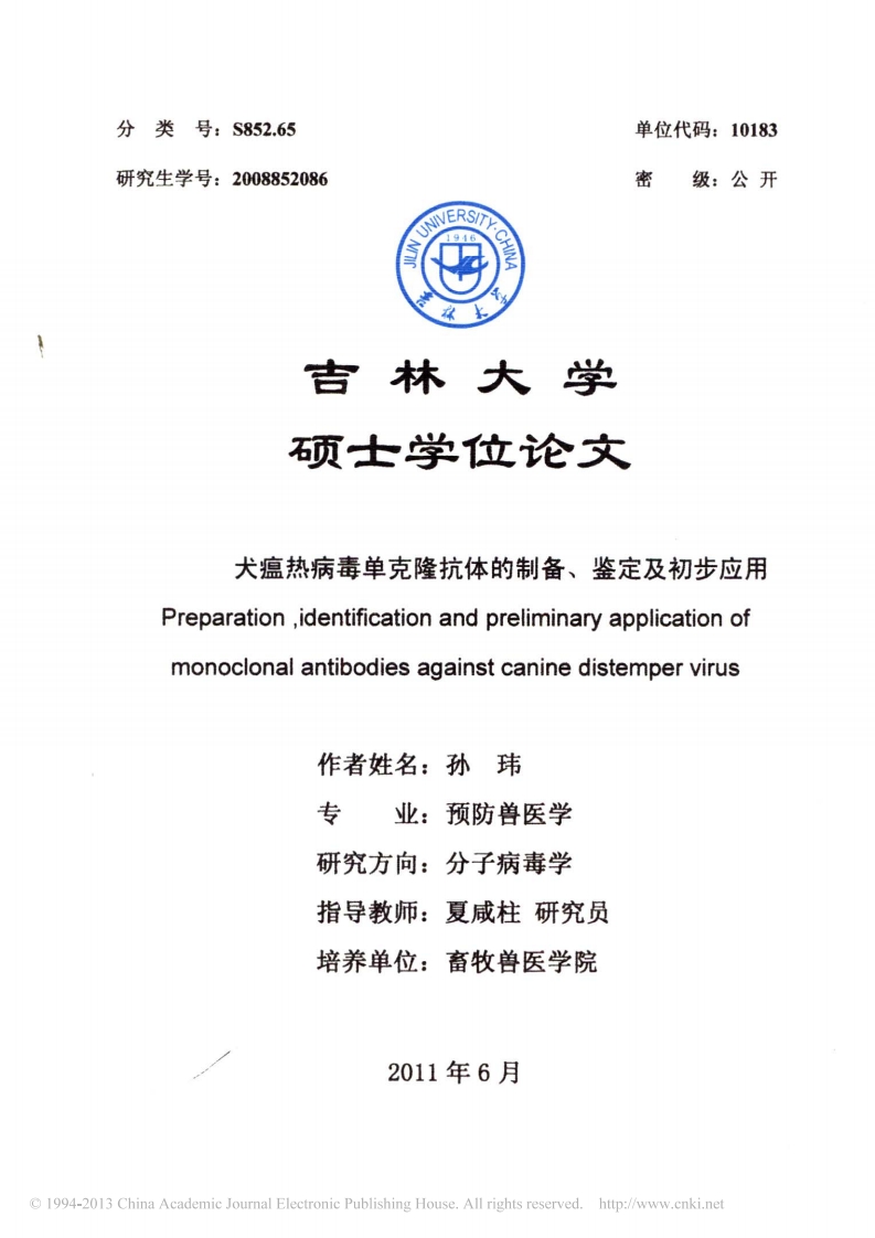 分类号:S852.65单位代码:10183研究生学号:2008852086密级:公开1946吉林大学硕士学位论文犬瘟热病毒单克隆抗体的制备、鉴定及初步应用Preparation,identification and preliminary application ofmonoclonal antibodies against canine distemper virus作者姓名:孙玮专业:预防兽医学研究方向:分子病毒学指导教师:夏咸柱研究员培养单位:畜牧兽医学院2011年6月1994-2013 China Academic Journal Electronic Publishing House.All rights reserved.http://www.cnki.net犬瘟热病毒单克隆抗体的制备、鉴定及初步应用Preparation identification and preliminary application ofmonoclonal antibodies against canine distemper virus作者姓名:孙玮专业名称:预防兽医学指导教师:夏咸柱研究员学位类别:兽医硕士答辩日期:2011年6月C 1994-2013 China Academic Journal Electronic Publishing House.All rights reserved.http://www.cnki.net未经本论文作者的书面授权,依法收存和保管本论文书面版本、电子版本的任何单位和个人,均不得对本论文的全部或部分内容进行任何形式的复制、修改、发行、出租、改编等有碍作者着作权的商业性使用(但纯学术性使用不在此限)。否则,应承担侵权的法律责任。吉林大学硕士学位论文原创性声明本人郑重声明:所呈交学位论文,是本人在指导教师的指导下,独立进行研究工作所取得的成果。除文中已经注明引用的内容外,本论文不包含任何其他个人或集体已经发表或撰写过的作品成果。对本文的研究做出重要贡献的个人和集体,均已在文中以明确方式标明。本人完全意识到本声明的法律结果由本人承担。日期:201年6月7日1994-2013 China Academic Journal Electronic Publishing House.All rights reserved.http://www.cnki.net