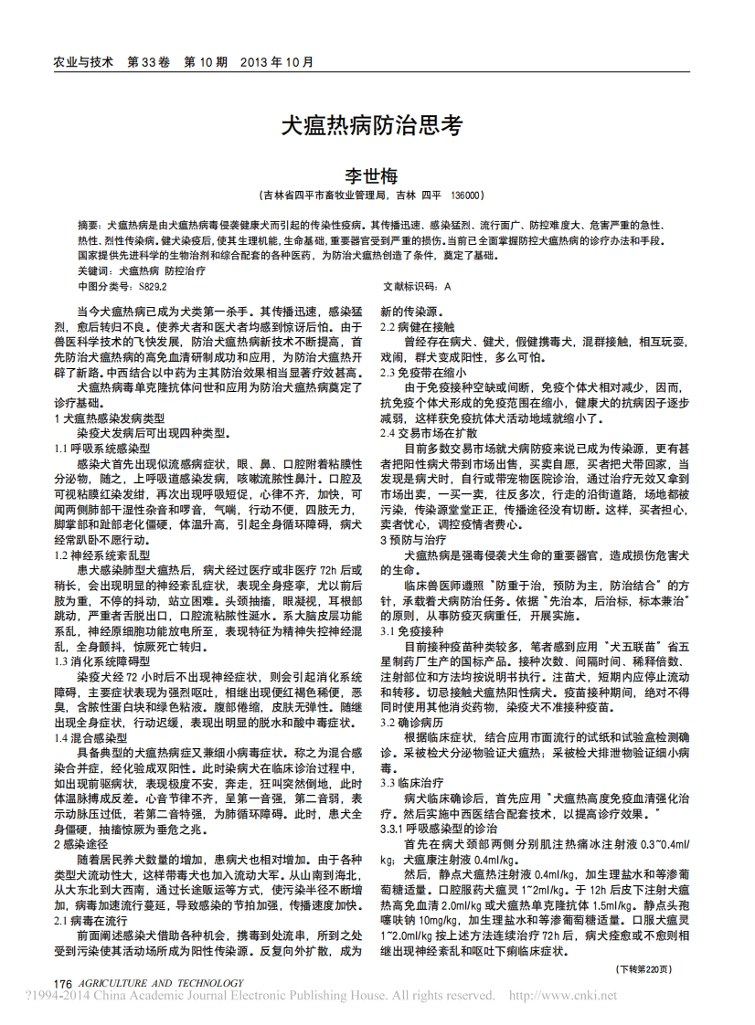 农业与技术第33卷第10期2013年10月犬瘟热病防治思考李世梅(吉林省四平市畜牧业管理局,吉林四平136000)摘要:犬瘟热病是由犬瘟热病毒侵袭健康犬而引起的传染性疫病。其传播迅速、感染猛烈,流行面广、防控难度大、危害严重的急性,热性,烈性传染病,健犬染疫后,使其生理机能,生命基础,重要器官受到严重的损伤,当前已全面掌握防控犬瘟热病的诊疗办法和手段,国家提供先进科学的生物治剂和综合配套的各种医药,为防治犬瘟热创造了条件,莫定了基础。关键词:犬瘟热病防控治疗中图分类号:S829.2文献标识码:A当今犬瘟热病已成为犬类第一杀手。其传播迅速,感染猛新的传染源。烈,愈后转归不良。使养犬者和医犬者均感到惊讶后怕。由于2.2病健在接触兽医科学技术的飞快发展,防治犬瘟热病新技术不断提高,首曾经存在病犬、健犬,假健携毒犬,混群接触,相互玩耍,先防治犬瘟热病的高免血清研制成功和应用,为防治犬瘟热开戏闹,群犬变成阳性,多么可怕。辟了新路。中西结合以中药为主其防治效果相当显著疗效甚高,2.3免疫带在缩小犬瘟热病毒单克隆抗体问世和应用为防治犬瘟热病奠定了由于免疫接种空缺或间断,免疫个体犬相对减少,因而,诊疗基础。抗免疫个体犬形成的免疫范围在缩小,健康犬的抗病因子逐步1犬瘟热感染发病类型减弱,这样获免疫抗体犬活动地域就缩小了,染疫犬发病后可出现四种类型,2.4交易市场在扩散1.1呼吸系统感染型目前多数交易市场就犬病防疫来说已成为传染源,更有甚感染犬首先出现似流感病症状,眼、鼻、口腔附着粘膜性者把阳性病犬带到市场出售,买卖自愿,买者把犬带回家,当分泌物,随之,上呼吸道感染发病,咳嗽流脓性鼻汁。口腔及发现是病犬时,自行或带宠物医院诊治,通过治疗无效又拿到可视粘膜红染发绀,再次出现呼吸短促,心律不齐,加快,可市场出卖,一买一卖,往反多次,行走的沿街道路,场地都被闻两侧肺部干湿性杂音和啰音,气喘,行动不便,四肢无力,污染,传染源堂堂正正,传播途径没有切断。这样,买者担心,脚掌部和趾部老化僵硬,体温升高,引起全身循环障碍,病犬卖者忧心,调控疫情者费心。经常趴卧不愿行动,3预防与治疗1.2神经系统紊乱型犬瘟热病是强毒侵袭犬生命的重要器官,造成损伤危害犬患犬感染肺型犬瘟热后,病犬经过医疗或非医疗72h后或稍长,会出现明显的神经素乱症状,表现全身痉孪,尤以前后临床兽医师遵照“防重于治,预防为主,防治结合”的方肢为重,不停的抖动,站立困难。头颈抽搐,眼凝视,耳根部针,承载着犬病防治任务。依据"先治本,后治标,标本兼治”跳动,严重者舌脱出口,口腔流粘脓性涎水。系大脑皮层功能的原则,从事防疫灭病重任,开展实施。系乱,神经原细胞功能放电所至,表现特征为精神失控神经混3.1免疫接种乱,全身颤抖,惊厥死亡转归。目前接种疫苗种类较多,笔者感到应用“犬五联苗”省五1.3消化系统障碍型星制药厂生产的国标产品。接种次数、间隔时间、稀释倍数、染疫犬经72小时后不出现神经症状,则会引起消化系统注射部位和方法均按说明书执行。注苗犬,短期内应停止流动障碍,主要症状表现为强烈呕吐,相继出现便红褐色稀便,恶和转移。切忌接触犬瘟热阳性病犬。疫苗接种期间,绝对不得臭,含脓性蛋白块和绿色粘液。腹部倦缩,皮肤无弹性。随继同时使用其他消炎药物,染疫犬不准接种疫苗。出现全身症状,行动迟缓,表现出明显的脱水和酸中毒症状。3.2确诊病历1.4混合感染型根据临床症状,结合应用市面流行的试纸和试验盒检测确具备典型的犬瘟热病症又兼细小病毒症状。称之为混合感诊。采被检犬分泌物验证犬瘟热:采被检犬排泄物验证细小病染合并症,经化验成双阳性。此时染病犬在临床诊治过程中,毒如出现前驱病状,表现极度不安,奔走,狂叫突然倒地,此时3.3临床治疗体温脉搏成反差。心音节律不齐,呈第一音强,第二音弱,表病犬临床确诊后,首先应用“犬瘟热高度免疫血清强化治示动脉压过低,若第二音特强,为肺循环障碍。此时,患犬全疗。然后实施中西医结合配套技术,以提高诊疗效果。身僵硬,抽搐惊厥为垂危之兆。3.3.1呼吸感染型的诊治2感染途径首先在病犬颈部两侧分别肌注热痛冰注射液0.30.4ml随着居民养犬数量的增加,患病犬也相对增加。由于各种类型犬流动性大,这样带毒犬也加入流动大军。从山南到海北,然后,静点犬瘟热注射液0.4mlkg,加生理盐水和等渗葡从大东北到大西南,通过长途贩运等方式,使污染半径不断增萄糖适量。口腔服药犬瘟灵1~2mlkg。于12h后皮下注射犬瘟加,病毒加速流行蔓延,导致感染的节拍加强,传播速度加快。热高免血清2.0 ml/kg或犬瘟热单克隆抗体1.5mlkg。静点头孢2.1病毒在流行噻呋钠10gkg,加生理盐水和等渗葡萄糖适量。口服犬瘟灵前面阐述感染犬借助各种机会,携毒到处流串,所到之处12.0mlkg按上述方法连续治疗72h后,病犬痊愈或不愈则相受到污染使其活动场所成为阳性传染源。反复向外扩散,成为继出现神经紊乱和呕吐下痢临床症状。(下转第220页)176 AGRICULTURE AND TECHNOLOGY21994-2014 China Academic Journal Electronic Publishing House.All rights reserved.http://www.cnki.net农业与技术第33卷第10期2013年10月4.3品种价格控制丹糯3001号糯玉米由丹玉种业独家生产与开发。辽宁丹我国糯玉米种子仍处于低水平营销,种子和粮食的价格比玉种业科技股份有