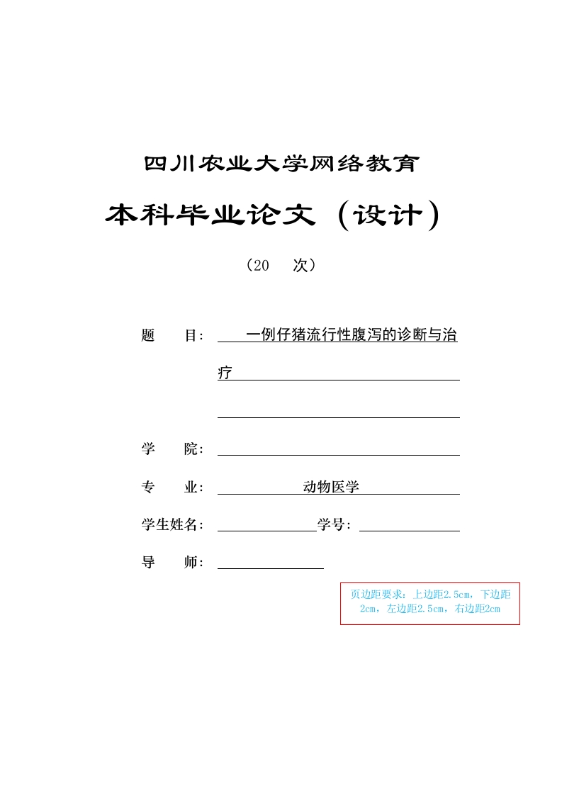 四川农业大学网络教育本科毕业论文(设计)(20次)题目:一例仔猪流行性腹泻的诊断与治疗学院:专业:动物医学学生姓名:学号:导师:页边距要求:上边距2.5cm,下边距2cm,左边距2.5cm,右边距2cm一列仔猪流行性腹泻的诊断与治疗摘要:猪流行性腹泻是重要的消化道传染病,该病影响猪的生长速度,严重情况下可致死亡,各个年龄的猪都能感染发病,特别是在10日龄以内的产房仔猪,发病率和死亡率均较高,而且该病也会减缓育肥猪的生长速度。部分耐过猪会伴随肠道绒毛的永久损伤,造成后期培育过程中料肉比增高是困扰养猪生产的最重要疾病之一。2020年云南帝福农饶阳一场发生的这次腹泻病是该场发病最为严重的一次,与之前有所差别,造成了严重的损失。本文基于在帝福农集团饶阳一场猪腹泻病的防控实例,对其临床表现进行观察,结合分子诊断技术复盘了该场流行性腹泻从发生、诊断以及综合防控的全过程,分析了该病发生的可能原因,整理了应对该病的综合防控措施以期为养猪生产提供指导。关键词:猪仔死亡;流行病学;腹泻病毒Diagnosis and treatment of epidemic diarrhea in acolumn of pigletsAbstract:Pig epidemic diarrhea is an important digestive tract infectious disease,the disease affects the growth rate of pigs,can cause death in serious cases,pigs of allages can be infected,especially in the delivery room of within 10 days of age piglets,morbidity and mortality are higher,and the disease will also slow down the growthrate of finishing pigs.Some resistant pigs will be accompanied by the permanentdamage of intestinal villi,resulting in the increased ratio of raw meat in the laterbreeding process is one of the most important diseases troubling pig production.In2020,a diarrhea disease in Raoyang,Dabei farmer,Hebei province,was the mostserious one,which was different from before and caused serious losses.This article isbased on the big north agricultural group Rao Yang prevention and control of a pigdiarrhea case,observe its clinical manifestations,combined with molecular diagnosistechnology to review the epidemic diarrhea from the occurrence,diagnosis andcomprehensive prevention and control process,analyzes the possible causes of thedisease,organize the comprehensive prevention and control measures for the diseasein order to provide guidance for pig production.Key words:piglets death;epidemiology;diarrhea virus