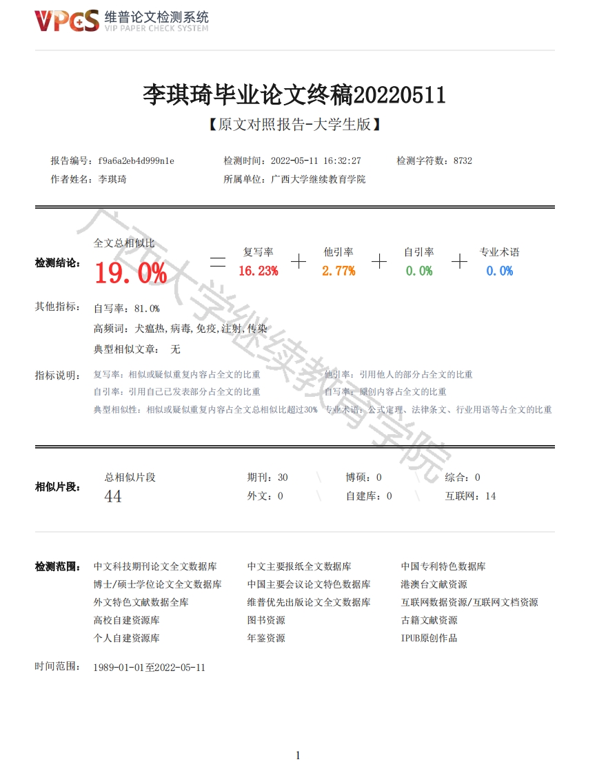 维普论文检测系统VIP PAPER CHECK SYSTEM李琪琦毕业论文终稿20220511【原文对照报告-大学生版】报告编号:f9a6a2eb4d999nle检测时间:2022-05-1116:32:27检测字符数:8732作者姓名:李琪琦所属单位:广西大学继续教育学院全文总相似比复写率他引率自引率专业术语检测结论:19.0%16.23%2.77%0.0%0.0%其他指标:自写率:81.0%高频词:犬瘟热,病毒,免疫,注射,传染典型相似文章:无指标说明:复写率:相似或疑似重复内容占全文的比重他引率:引用他人的部分占全文的比重自引率:引用自己已发表部分占全文的比重自写率:原创内容占全文的比重典型相似性:相似或疑似重复内容占全文总相似比超过30%专业术语:公式定理、法律条文、行业用语等占全文的比重总相似片段期刊:30博硕:0综合:0相似片段:44外文:0自建库:0互联网:14检测范围:中文科技期刊论文全文数据库中文主要报纸全文数据库中国专利特色数据库博士/硕士学位论文全文数据库中国主要会议论文特色数据库港澳台文献资源外文特色文献数据全库维普优先出版论文全文数据库互联网数据资源/互联网文档资源高校自建资源库图书资源古籍文献资源个人自建资源库年鉴资源IPUB原创作品时间范围:1989-01-01至2022-05-11维普论文检测系统VIP PAPER CHECK SYSTEM原文对照颜色标注说明:■自写片段■复写片段(相似或疑似重复)口引用片段(引用)■专业术语(公式定理、法律条文、行业用语等)成人高等教育毕业设计(论文)题目犬瘟热的诊断与预防学院:继续教育学院专业动物科学学号:202030111410040学生姓名:李琪琦指导教师:王晓晔二0二二年三月十日摘要随着时代的进步,以及人民生活水平日益提升,中国的宠物饲养量逐渐增多,但同时也伴随着不少疫病的发生。如犬细小病毒感染、犬瘟热、犬传染性肝炎、狗副流感病等,而在上述病变中,以犬瘟热的危害最高,一旦到了后期就很难治愈,会造成巨大的损失。犬瘟热是高度接触性传染性和致病性传染病。该病致死幼犬达到八成。本病往往造成混杂病毒感染或继发感染。犬瘟热初期发生的打喷嚏、腹泻、体温上升:中期有脓性鼻液:而后期的犬瘟热则会影响到中枢神经系统,而犬瘟热又因其复杂的临床表现,使人在临床治疗时期往往会觉得很头痛,尤其是在后期发生神经系统病症后就更加不易治疗了。所以,除了前期通过注射疫苗来使机体产生免疫,来此达到对犬瘟热的控制:在诊断病因的时候还需要快速确诊该病是至关重要。本论文就对犬瘟热的发病机理、诊断的情况、免疫失败的原因、中西医治疗法和预防措施进行论述,将犬瘟热所造成的损害降至最小。关键词:犬瘟热诊断防治治疗目录2VPCS维普论文检测系统VIP PAPER CHECK SYSTEM二、诊断·········(二)病因病理(三)临床症状·····(四)临床诊断·······1、犬瘟热与感冒的鉴别诊断·······2、犬瘟热与犬细小病毒性肠炎的辨别诊断···(五)实验室诊断············(六)CDV检测试纸诊断三、治疗方法·········4(二)中医治疗(三)西医疗法·········(四)营养与监护····四、基本病例····(一)基本情况·····(三)临床检查······(四)诊断·······(五)处置·····五、免疫失败会造成犬瘟热的发生(三)母源抗体的干扰(四)犬本身的原因····(五)人为因素······六、预防··········3