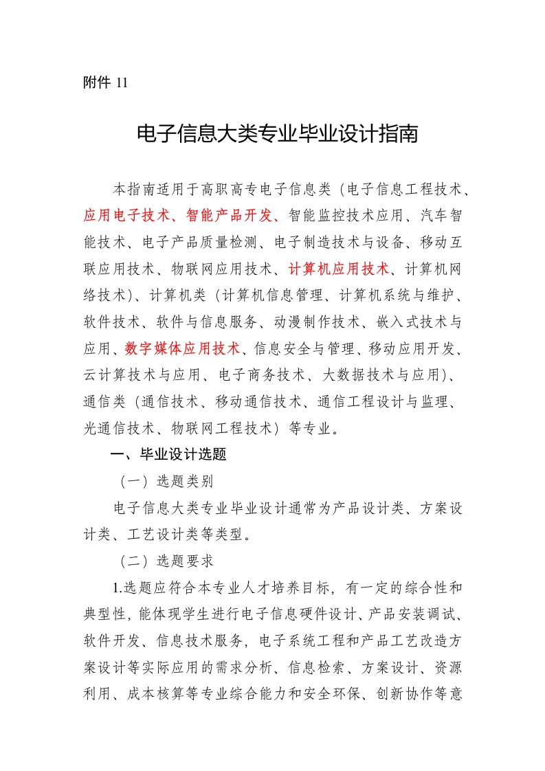 附件11电子信息大类专业毕业设计指南本指南适用于高职高专电子信息类(电子信息工程技术、应用电子技术、智能产品开发、智能监控技术应用、汽车智能技术、电子产品质量检测、电子制造技术与设备、移动互联应用技术、物联网应用技术、计算机应用技术、计算机网络技术)、计算机类(计算机信息管理、计算机系统与维护、软件技术、软件与信息服务、动漫制作技术、嵌入式技术与应用、数字媒体应用技术、信息安全与管理、移动应用开发、云计算技术与应用、电子商务技术、大数据技术与应用)、通信类(通信技术、移动通信技术、通信工程设计与监理、光通信技术、物联网工程技术)等专业。一、毕业设计选题(一)选题类别电子信息大类专业毕业设计通常为产品设计类、方案设计类、工艺设计类等类型。(二)选题要求1.选题应符合本专业人才培养目标,有一定的综合性和典型性,能体现学生进行电子信息硬件设计、产品安装调试、软件开发、信息技术服务,电子系统工程和产品工艺改造方案设计等实际应用的需求分析、信息检索、方案设计、资源利用、成本核算等专业综合能力和安全环保、创新协作等意识的培养要求。2选题体现出电子信息类专业的时代特征,应尽可能采用当前主流电子信息技术,贴近电子信息行业产业生产、生活实际,最好是来源于相关企业的真实电子信息类产品生产、信息技术行业应用或工程实际项目,可以解决生产和生活实际问题;提倡真题真做,完成软硬件产品(作品)设计和制作、电子信息相关工程方案、工艺规划或设计。3.选题应大小适中、难易适度,难易度和工作量应适合学生的知识和能力状况,确保学生在规定时间内工作量饱满,且能完成任务。4.毕业设计原则上做到“一人一题”,选题避免雷同。对于综合性较强、工作量大的设计课题(如较复杂的电子产品或者应用系统设计制作、综合性较强的信息系统工程方案等)可分解为若干子课题,学生分工合作,任务到人,确保每个学生通过努力能取得相应成果,并在各自的设计任务书和设计成果等方面体现差异。(三)选题示例1.产品设计类(1)增益可控高频放大器设计与制作(2)基于单片机的多路温湿度检测系统设计与制作(3)基于单片机的心率计的设计与制作(4)基于DSP的高频开关电源设计与实现(5)基于java的吃豆子游戏设计与实现(6)基于JS+PS技术的服装网站的设计与实现(7)基于asp.net的婚纱展示租赁系统设计与实现2.方案设计类(1)四旋翼无人机的组装方案设计(2)小区EPON宽带接入网规划设计(3)PRAN城域网络优化设计(4)长沙地铁智慧网络安防监控规划设计(5)中继光缆工程项目管理方案设计(6)株洲市水利局物联网工程规划设计(7)小型企业电子商务网站规划设计(8)XX公司网络信息安全与管理系统设计(9)基于java技术的飞机大战游戏设计方案(10)灵影科技公司网络规划方案(11)小型ERP系统项目实施方案设计3.工艺设计类(1)家用路由器装配工艺设计(2)XX品牌开关电源PCB工艺设计与实施(3)MP3的SMT装配工艺设计与实施二、毕业设计成果(一)产品设计类1.成果表现形式产品设计类毕业设计成果通常包括产品设计图纸与表