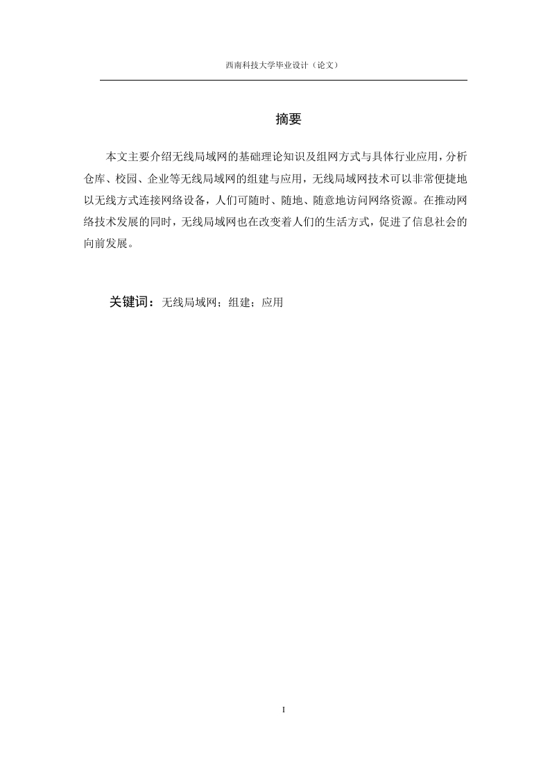 西南科技大学毕业设计〔论文)摘要本文主要介绍无线局域网的基础理论知识及组网方式与具体行业应用,分析仓库、校园、企业等无线局域网的组建与应用,无线局域网技术可以非常便捷地以无线方式连接网络设备,人们可随时、随地、随意地访问网络资源。在推动网络技术发展的同时,无线局域网也在改变着人们的生活方式,促进了信息社会的向前发展。关键词:无线局域网:组建;应用西南科技大学毕业设计(论文)目录第一章绪论1.1无线局域网的概述…21.2无线局域网的优缺点1.2.1无线局域网的优点…31.2.2无线局域网的缺点41.3无线局域网的理论基础.…1.3.1红外线局域网…41.3.2扩频局域网…1.3.3窄带微波局域网.1.4无线局域网的基础设备….5第二章无线局域网的组建方式…2.1网桥连接型2.2基站接入型…2.3集线器接入型.2.4无中心结构…第三章无线局域网接入Internet93.1单机无线上网.…3.1.1安装无线网卡93.1.2连接网络设备3.1.3无线路由器设置3.2多机共享上网…103.2.1硬件连接113.2.2配置无线路由器西南科技大学毕业设计(论文)第四章WLAN的安全134.1WLAN的安全现状.134.2新发展的安全协议标准第五章无线局域网的应用5.1在教育中的应用…...000185.2在医疗中的应用…5.3在销售行业的应用18参考文献.20致谢.21
