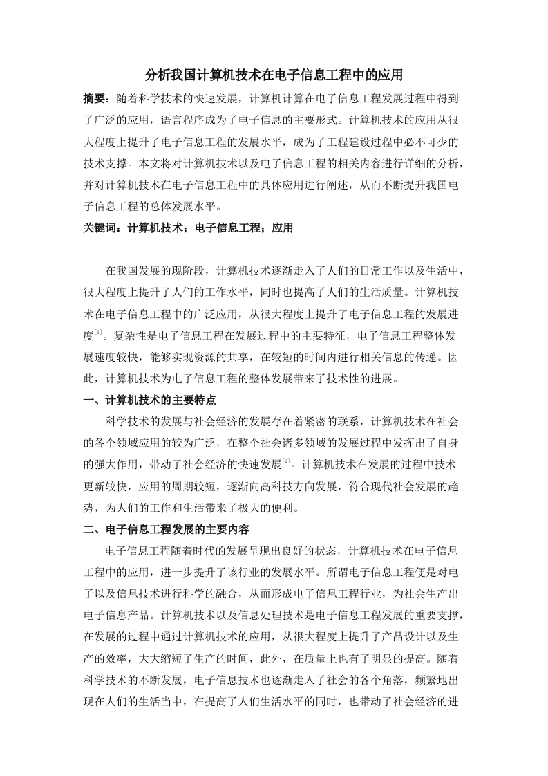 分析我国计算机技术在电子信息工程中的应用摘要:随着科学技术的快速发展,计算机计算在电子信息工程发展过程中得到了广泛的应用,语言程序成为了电子信息的主要形式。计算机技术的应用从很大程度上提升了电子信息工程的发展水平,成为了工程建设过程中必不可少的技术支撑。本文将对计算机技术以及电子信息工程的相关内容进行详细的分析,并对计算机技术在电子信息工程中的具体应用进行阐述,从而不断提升我国电子信息工程的总体发展水平。关键词:计算机技术;电子信息工程;应用在我国发展的现阶段,计算机技术逐渐走入了人们的日常工作以及生活中,很大程度上提升了人们的工作水平,同时也提高了人们的生活质量。计算机技术在电子信息工程中的广泛应用,从很大程度上提升了电子信息工程的发展进度。复杂性是电子信息工程在发展过程中的主要特征,电子信息工程整体发展速度较快,能够实现资源的共享,在较短的时间内进行相关信息的传递。因此,计算机技术为电子信息工程的整体发展带来了技术性的进展。一、计算机技术的主要特点科学技术的发展与社会经济的发展存在着紧密的联系,计算机技术在社会的各个领域应用的较为广泛,在整个社会诸多领域的发展过程中发挥出了自身的强大作用,带动了社会经济的快速发展。计算机技术在发展的过程中技术更新较快,应用的周期较短,逐渐向高科技方向发展,符合现代社会发展的趋势,为人们的工作和生活带来了极大的便利。二、电子信息工程发展的主要内容电子信息工程随着时代的发展呈现出良好的状态,计算机技术在电子信息工程中的应用,进一步提升了该行业的发展水平。所谓电子信息工程便是对电子以及信息技术进行科学的融合,从而形成电子信息工程行业,为社会生产出电子信息产品。计算机技术以及信息处理技术是电子信息工程发展的重要支撑,在发展的过程中通过计算机技术的应用,从很大程度上提升了产品设计以及生产的效率,大大缩短了生产的时间,此外,在质量上也有了明显的提高。随着科学技术的不断发展,电子信息技术也逐渐走入了社会的各个角落,频繁地出现在人们的生活当中,在提高了人们生活水平的同时,也带动了社会经济的进一步发展。此外,电子信息工程在发展的过程中,其内部的图像、数据以及文字等内容都是通过计算机技术来进行整合的,同时也能够通过计算机形式展现出来,为电子信息工程的发展提供了技术支持。因此,在电子信息工程的发展过程中,融入计算机技术,二者进行有效的融合,能够实现共同发展。三、计算机技术在电子信息工程中的具体应用(一)计算机技术在电子信息工程进行信息传递计算机技术在电子信息工程中进行信息的传递,能够实现电子信息工程对相关数据的良好整合,使得工程项目达到良好的效果。因此,在电子信息工程长期发展过程中,计算机技术逐渐成为了其发展的媒介,电子信息在运行的过程中需要通过计算机技术进行重要数据的传输,逐步实现在信息、数据等资源方面的共享,达到良好的电子信息工程的发展效果。此外,电子信息工程在发展的过程中引用计算机技术,能够快速获得重要的信息,实现信息的效率最大化,很大程度上提升了电子信息工程对相关信息的处理整体效率,从而促进了电子信息工程的快速发展。(二)计算机技术在电子信息工程中进行设备的研发电子信息工程在发展的过程中对设备的研发引用了计算机技术,计算机技术体现出了其自身发展的优势地位,很大程度上提升了电子信息工程中设备的研发效率。因此,在电子信息工程的发展过程中,应用计算机技术,能够有效缩短设备研发的时间,实现工程发展的主要目标。随着社会经济的不断发展,计算机技术在电子信息工程的发展过程中应用的范围越来越广,众多的设备逐渐具备了网络的强大功能,为我国电子信息工程的长远发展奠定了良好的基础。(三)计算机技术在电子信息工程中进行信息控制和处理随着我国信息化产业的不断发展,电子信息工程逐渐成为信息化产业的主要形式,同时需要融入计算机技术,为电子信息工程的发展提供技术支持。电子信息工程在长期的发展过程中改变了以往的发展模式,在整个发展过程中采用信息控制的方式,对相关信息进行控制和处理,达到了良好的计算效果。此外,在我国航天领域的发展过程中,也涉及到了诸多的电子信息工程知识,同时计算机技术的应用,从很大程度上实现了信息的资源共享。(四)计算机技术在电子信息工程中确保安全性电子信息工程在发展的过程中对计算机技术的应用,虽然带来一定程度上的发展,能够在短时期内进行重要信息的有效传递,但在发展的过程中容易产生重要信息的外露,遭受人为的篡改,在安全性上受到了严重的威胁。计算机技术需要在未来的发展过程中进行提升,在电子信息工程发展的过程中倘若出现重要信息的外露,能够通过计算机技术的应用,在第一时间内发现到问题的所在,同时采取有效的措施解决存在的问题,避免重要信息产生丢失。此外,在电子信息工程发展的过程中,做好安全方面的管理,针对重要信息文件等可自动进行备份,从很大程度上提升了电子信息工程在发展过程中的安全性。结语:总而言之,计算机技术在电子信息工程中的广泛应用,促进了电子信息工程的快