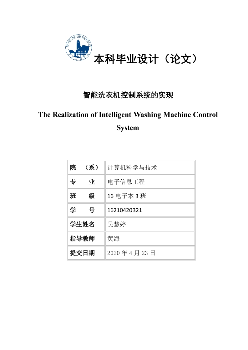 本科毕业设计(论文)智能洗衣机控制系统的实现The Realization of Intelligent Washing Machine ControlSystem院(系)计算机科学与技术专业电子信息工程班级16电子本3班学号16210420321学生姓名吴慧婷指导教师黄海提交日期2020年4月23日毕业设计(论文)原创性声明本人郑重声明:所呈交的毕业设计(论文),是本人在指导老师的指导下,独立进行的设计(研究)工作及取得的成果,论文中引用他人的文献、数据、图件、资料均已明确标注出,论文中的结论和结果为本人独立完成,不包含他人已经发表或撰写的作品及成果。对本文的研究作出贡献的个人和集体,均已在论文中作了明确的说明。本人完全意识到本声明的法律结果由本人承担。毕业论文作者(签字):签字日期:年月日指导教师评分:评阅教师评分:答辩小组评分:总评成绩:系主任签字(盖章):年月日