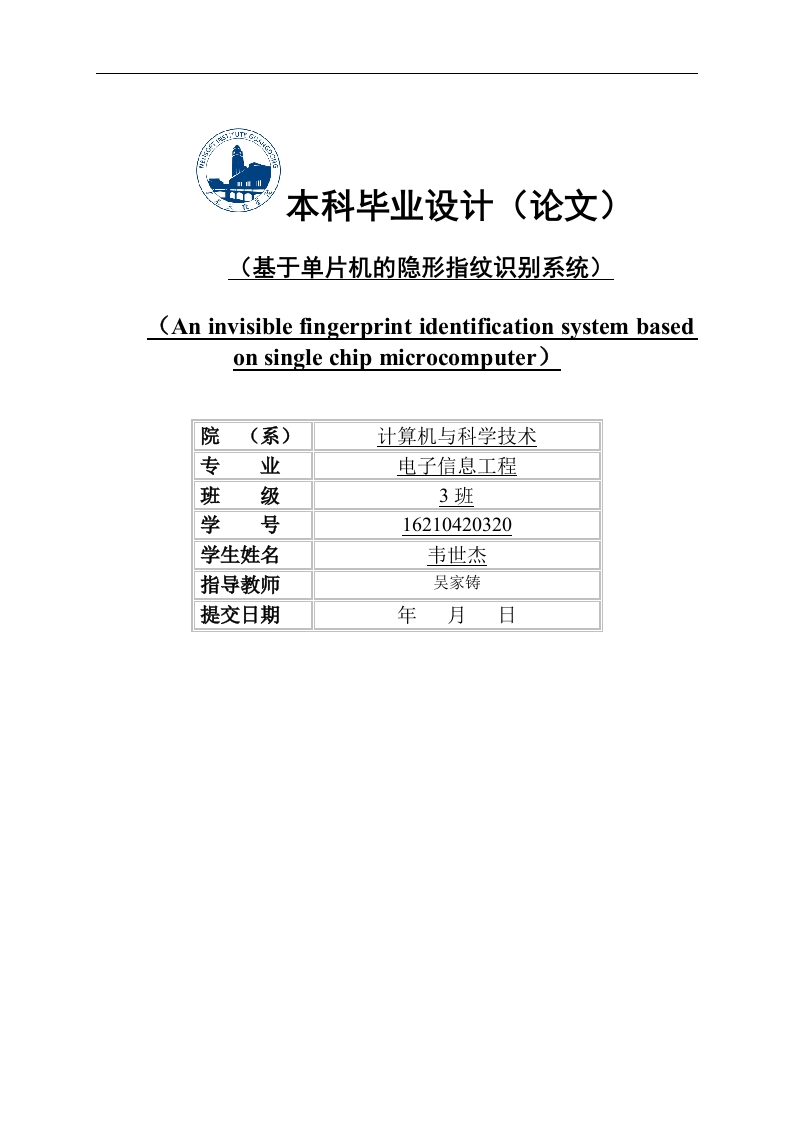 本科毕业设计(论文)(基于单片机的隐形指纹识别系统)(An invisible fingerprint identification system basedon single chip microcomputer院(系)计算机与科学技术专业电子信息工程班级3班学号16210420320学生姓名韦世杰指导教师吴家铸提交日期年月日毕业设计(论文)原创性声明本人郑重声明:所呈交的毕业设计(论文),是本人在指导老师的指导下,独立进行的设计(研究)工作及取得的成果,论文中引用他人的文献、数据、图件、资料均已明确标注出,论文中的结论和结果为本人独立完成,不包含他人已经发表或撰写的作品及成果。对本文的研究作出贡献的个人和集体,均已在论文中作了明确的说明。本人完全意识到本声明的法律结果由本人承担。毕业论文作者(签字):签字日期:年月日成绩评定成绩项论文成绩(百分折合比例实得成绩(折合制)分)指导教师成绩30%评阅教师成绩20%答辩成绩50%总评成绩注:毕业设计(论文)成绩按百分制评定。答辩成绩不及格的(评分低于60分的),则该毕业设计(论文)总评成绩为答辩成绩。